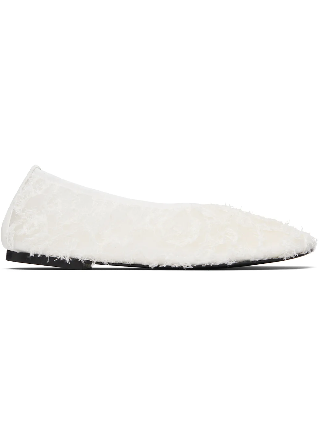 Sheer mesh ballerina flats. · Loose thread detailing throughout · Square toe · Buffed leather trim at heel counter · Stacked rubber heel · Polished calfskin sole Supplier color: White Upper: textile. Sole: calfskin. Made in Italy 261288F118004