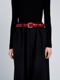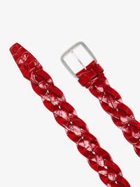 The Wide Braid Belt in Croc Embossed Calf is hand-braided in Italy using vegetable-dyed calfskin. Features a silver-tone buckle and a small embossed monogram at the belt's end. Details - Bordeaux - Croc embossed - Vegetable dyed calfskin - Silver-tone buckle - Keeper strap - Hand braided in Italy - 100% calfskin - SKU: B254004C536S618 Size & Fit - 2.5 cm wide Care - Please refer to care instructions provided with your order.