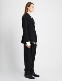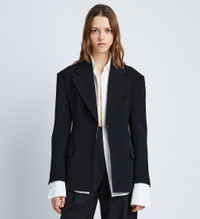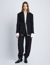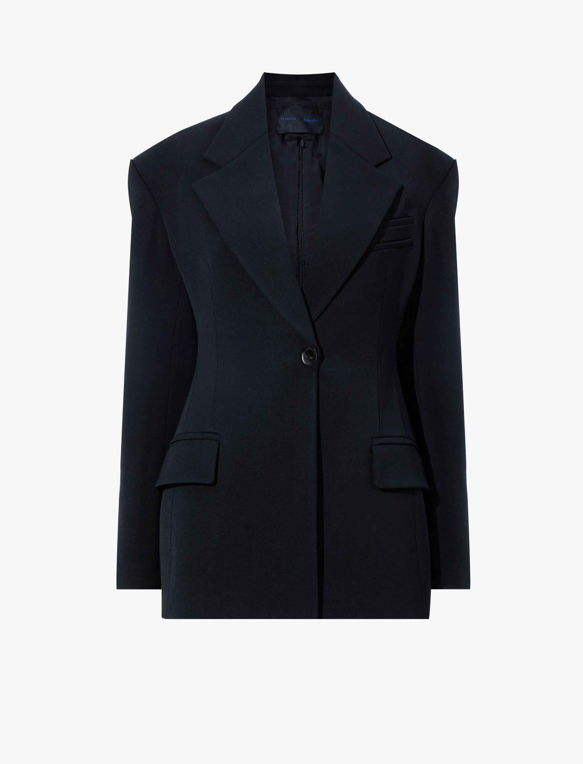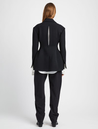 Fall 2023 Runway Collection | Look 02 The Wool Twill Jacket is tailored in virgin wool to a slim silhouette with emphasised shoulders and an adjustable zipped cut-out at the back. It nips in at the waist with princess darts that accentuate the hourglass shape. Black Notch lapels Padded shoulders Long sleeves with split cuffs Welt chest pocket Flap side pockets Adjustable cut-out at back with zip fastening Single back vent Satin lining Straight hem Button front fastening Slim fit 100% virgin wool; lining: 57% viscose, 43% polyester Made in Italy SKU: R2342000AW129001