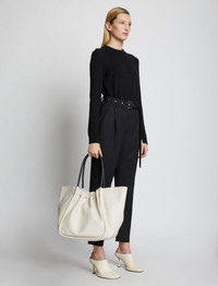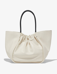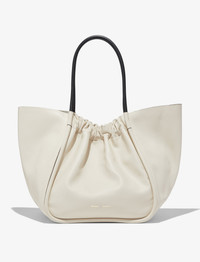 The XL Ruched Tote is crafted to an unstructured, sculptural silhouette. Wide piping sweeps up to a ruched open top and two curved top handles. The Tote family consists of the S Tote, L Tote, XL Tote, and XXL Tote. The XL Tote is the second largest of the family. Details - Off-white - Top handles - Open top with magnetic fastening - Gold-tone logo stamp - Unlined interior - Internal zip pouch - 100% leather - SKU: H01000C289P1036 Size & Fit - W: 56cm x H: 34cm x D: 24cm - Top Handle Height: 26cm Care - 100% leather - Our bags are hand crafted using genuine leather. Variations in tone, marks or grain are common and should not be considered imperfections. Like all natural materials, leather reacts to the atmosphere. Humidity, rain, and sunlight can damage leather. Should a slight white coating appear on the surface of the leather, it can easily be removed using a dry cloth. Should the leather get wet, please absorb the water immediately with a dry cloth. Overexposure to sunlight can stain or alter the color of the leather.