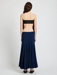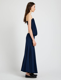 The Yael Dress in Matte Jersey is crafted to a strapless silhouette with gathered draping through the bodice. The skirt falls into a clean A-line shape with soft pleating. Details - Midnight - Strapless bustier - Draped volume - Open back - Side zipper closure - Ankle-length hem - Slim fit - 100% viscose - SKU: R2533029JY060401 Size & Fit - Model is 5'11'' with 30'' bust / 35.5'' hips. Wearing size 4 Care - 100% viscose - Dry clean only