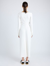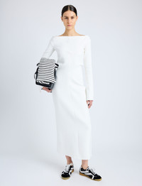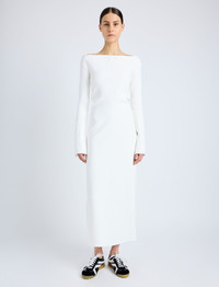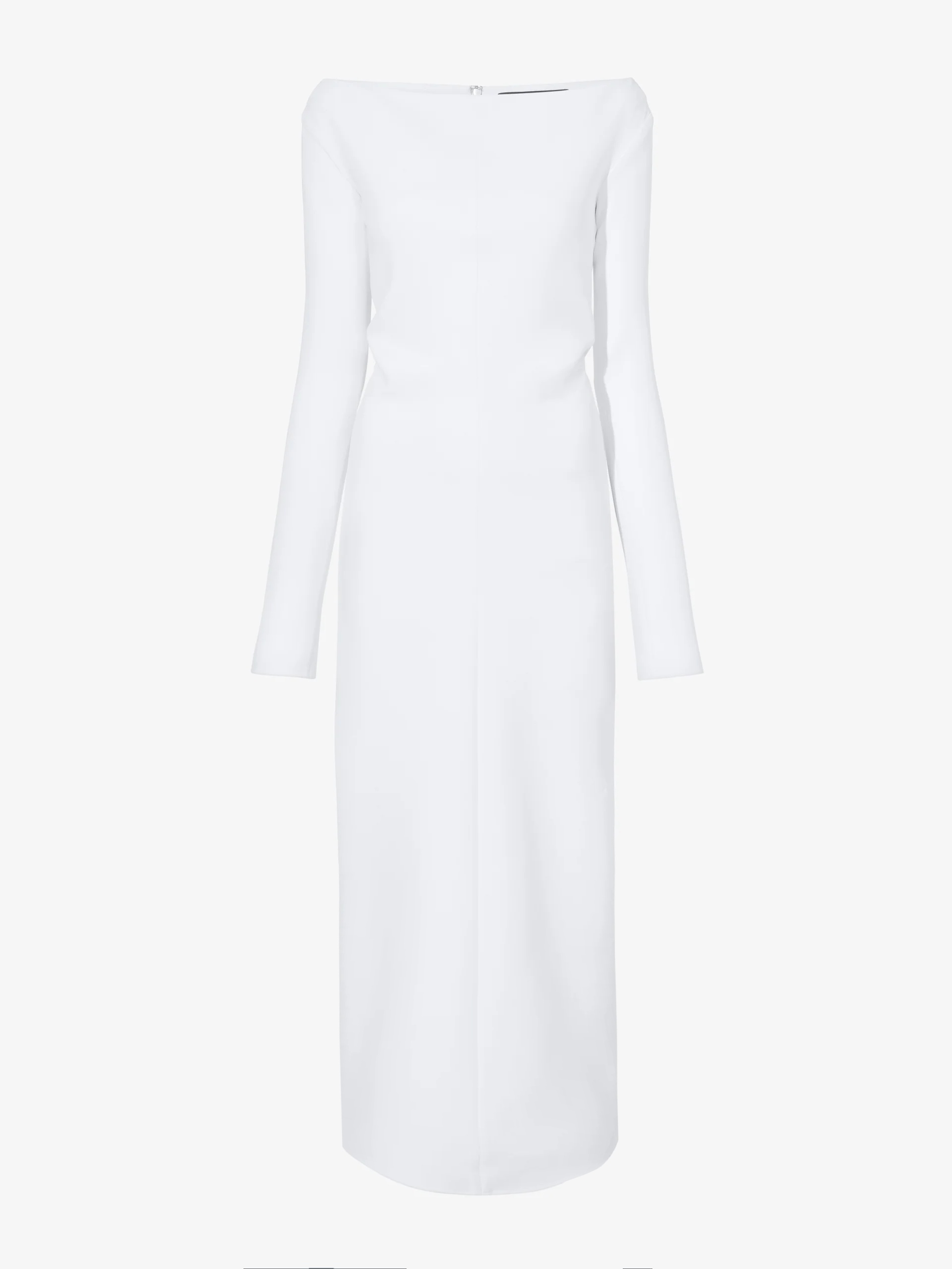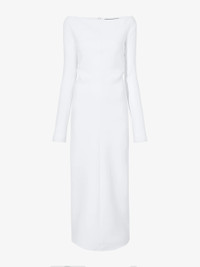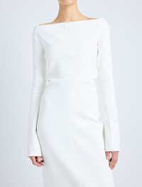 The Yara Dress in Bi-Stretch Suiting is crafted to a slim silhouette with a straight off-the-shoulder neckline. Completed with a center back zipper closure and extended split sleeve ends. Details - Off white - Off-the-shoulder neckline - Long sleeves - Split sleeve ends - Straight hem - Slim fit - 92% viscose, 8% elastane - SKU: R2513023AY137B102 Size & Fit - Model is 5'10'' with 32'' bust / 34'' hips. Wearing size 4 Care - 92% viscose, 8% elastane - Dry clean only