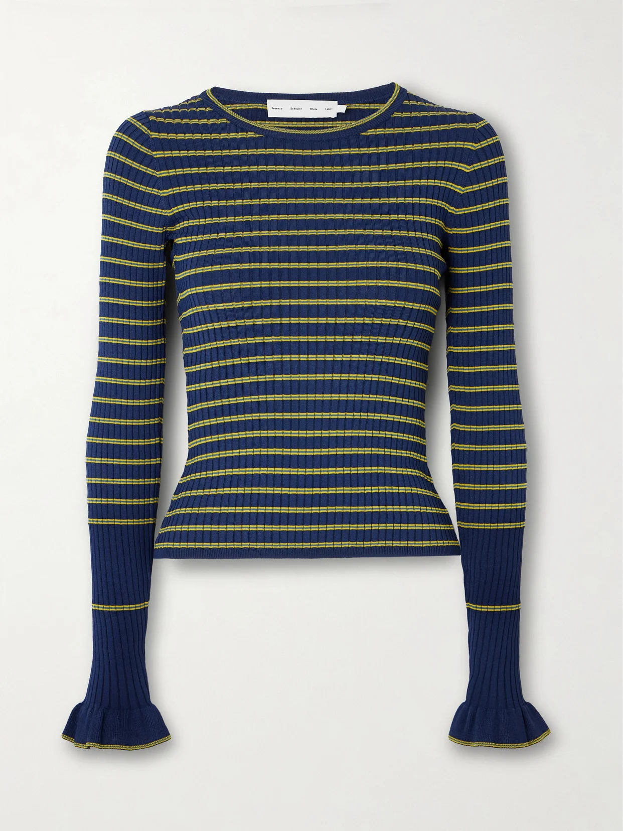 Delicate ruffles at the cuffs give Proenza Schouler White Label's ‘Yasmine' sweater an elegant, unexpected touch. It's rib-knitted for a close fit and patterned with horizontal stripes.
