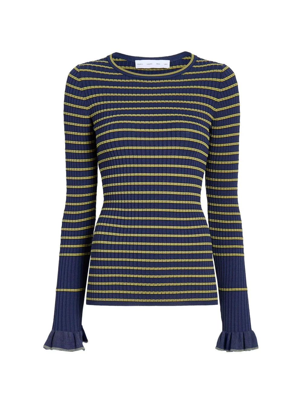 Yasmine striped ruffled sweater Highlights - Navy blue - Stripe pattern - Ribbed knit - Round neck - Long sleeves - Ruffled cuffs Imported Composition Fabric 100% Washing instructions Read Manufacturer Guidelines