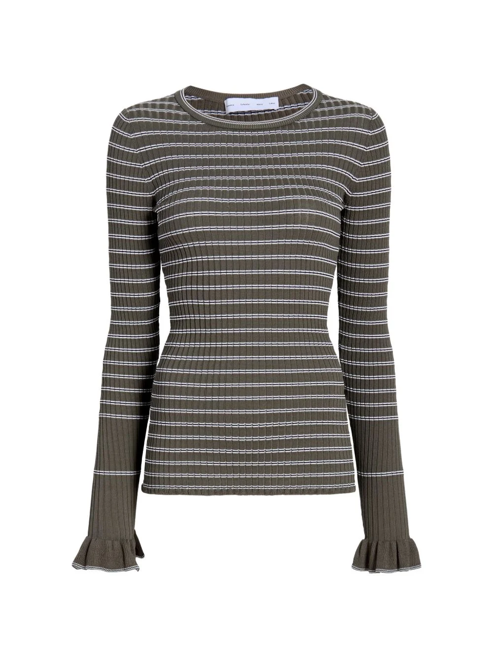 Yasmine striped sweater Highlights - Ivy green/white - Stripe pattern - Ruffled cuffs - Round neck - Long sleeves - Ribbed knit Imported Composition Fabric 100% Washing instructions Read Manufacturer Guidelines