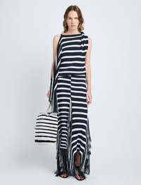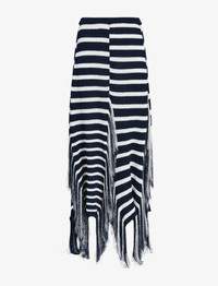 The Yves Skirt in Stripe Fringe Knit blends boucle viscose and smooth spun cotton yarns, creating a textural surface. Its fringe is integral to the panels, minimizing bulk and giving the knit expressive movement. Features a slim slip-on silhouette with a front split hem. Details - Navy multi - Textured yarn - Stripe pattern - Slip-on silhouette - Split hem - Integral fringe construction - Slim fit - 56% viscose, 26% polyester, 18% cotton - SKU: R2527254KY348466 Size & Fit - Model is 5'9.5'' with 32'' bust / 34'' hips. Wearing size Small Care - 56% viscose, 26% polyester, 18% cotton - Dry clean only