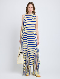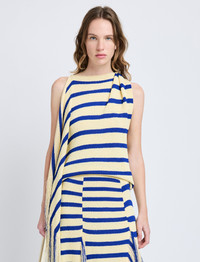 The Yves Top in Stripe Fringe Knit blends boucle viscose and smooth spun cotton yarns, creating a textural surface. Its fringe is integral to the panels, minimizing bulk and giving the knit expressive movement. Features a slim silhouette with a twisted shoulder strap and a fluid side drape extension. Details - Pale yellow multi - Textured yarn - Stripe pattern - Straight neckline - Sleeveless - Twisted strap - Side drape extension - Split side hem - Integral fringe construction - Slim fit - 56% viscose, 26% polyester, 18% cotton - SKU: R2527231KY348722 Size & Fit - Model is 5'9.5'' with 32'' bust / 34'' hips. Wearing size Small Care - 56% viscose, 26% polyester, 18% cotton - Dry clean only