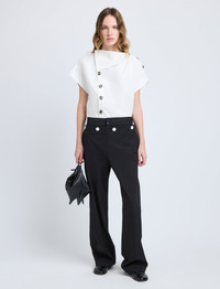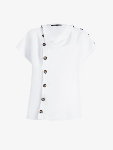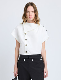 The Zion Top in Linen Viscose is designed with an easy, draped silhouette and a cowl neck. Buttons adorn the shoulder and down the length of the top, allowing for adjustment of the neckline drape and shoulder opening. Details - Off white - Cowl neckline - Adjustable drape - Short sleeves - Button plackets - Straight hem - 59% viscose, 41% linen - SKU: R2524013BY333102 Size & Fit - Model is 5'9.5'' with 32'' bust / 34'' hips. Wearing size 4 Care - 59% viscose, 41% linen - Dry clean only