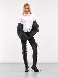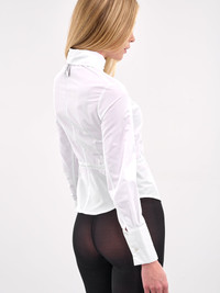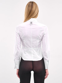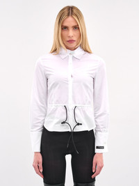 PROTOTYPES shirt in white, paneled nylon construction, spread collar, front concealed button placket closure, long sleeves, button cuffs, cuff logo patch, back signature tag, bodice darting, adjustable drawstring waist, curved hem, slim fit. Made in Italy 100% Nylon Standard Sizing Model is 5'8" wearing size XS. Bust: 32" Waist: 24" Hips: 35"