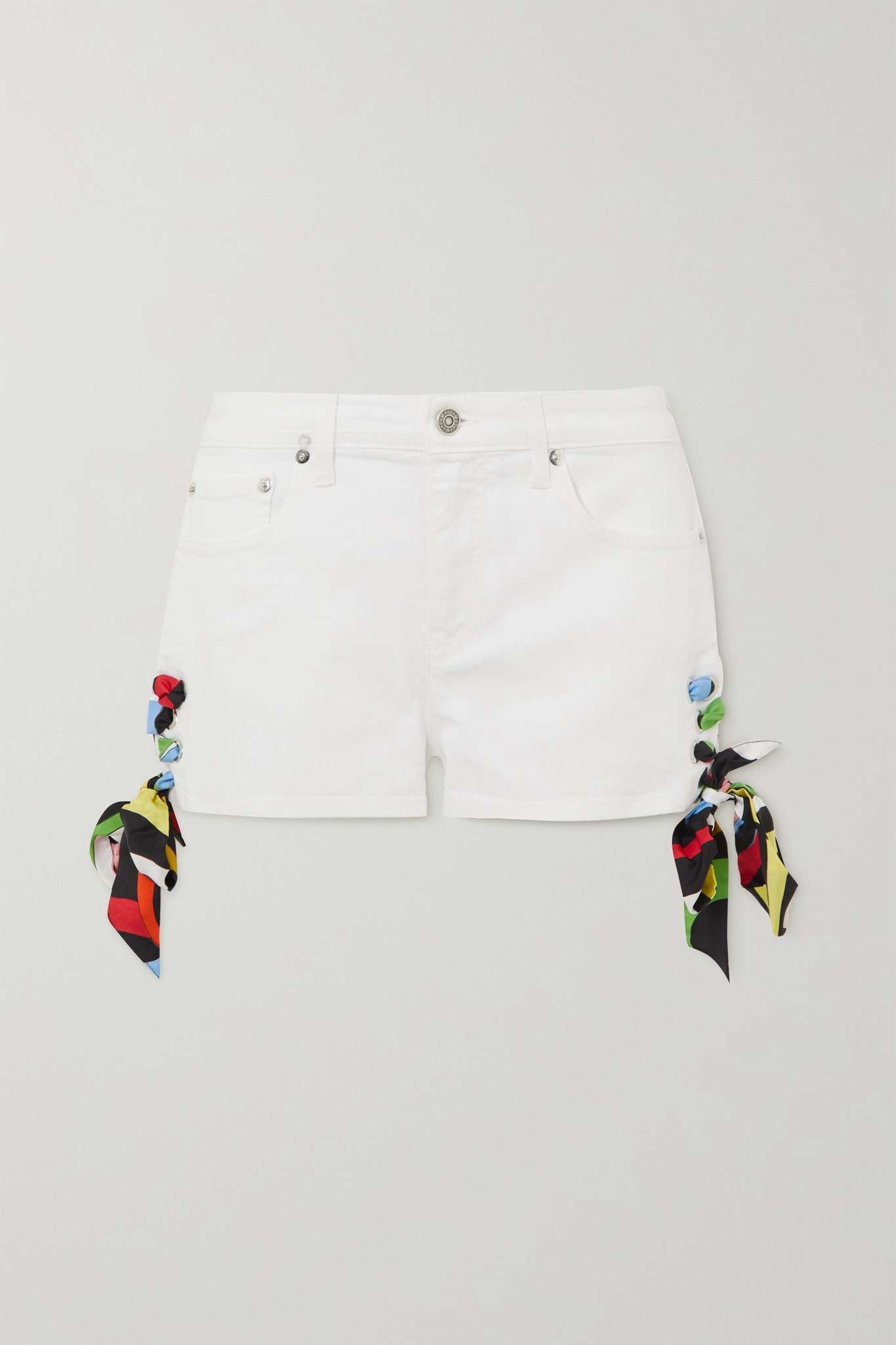 EDITORS'NOTES In her first collection at the helm of PUCCI, Creative Director Camille Miceli revisits the house's most iconic designs. These shorts are laced with the label's signature silk-twill ties, which pop against the white stretch-denim. Style yours with leather sandals and a shirt. SIZE & FIT - Fits true to size, take your normal size - Mid-rise, designed for a slightly loose fit - Mid-weight, slightly stretchy fabric - Model is 180cm/ 5’11” and is wearing an IT 40 DETAILS & CARE - White stretch-denim, multicolored silk-twill - Button and concealed zip fastening at front - Fabric1: 99% cotton, 1% elastane; fabric2: 100% silk - Dry clean