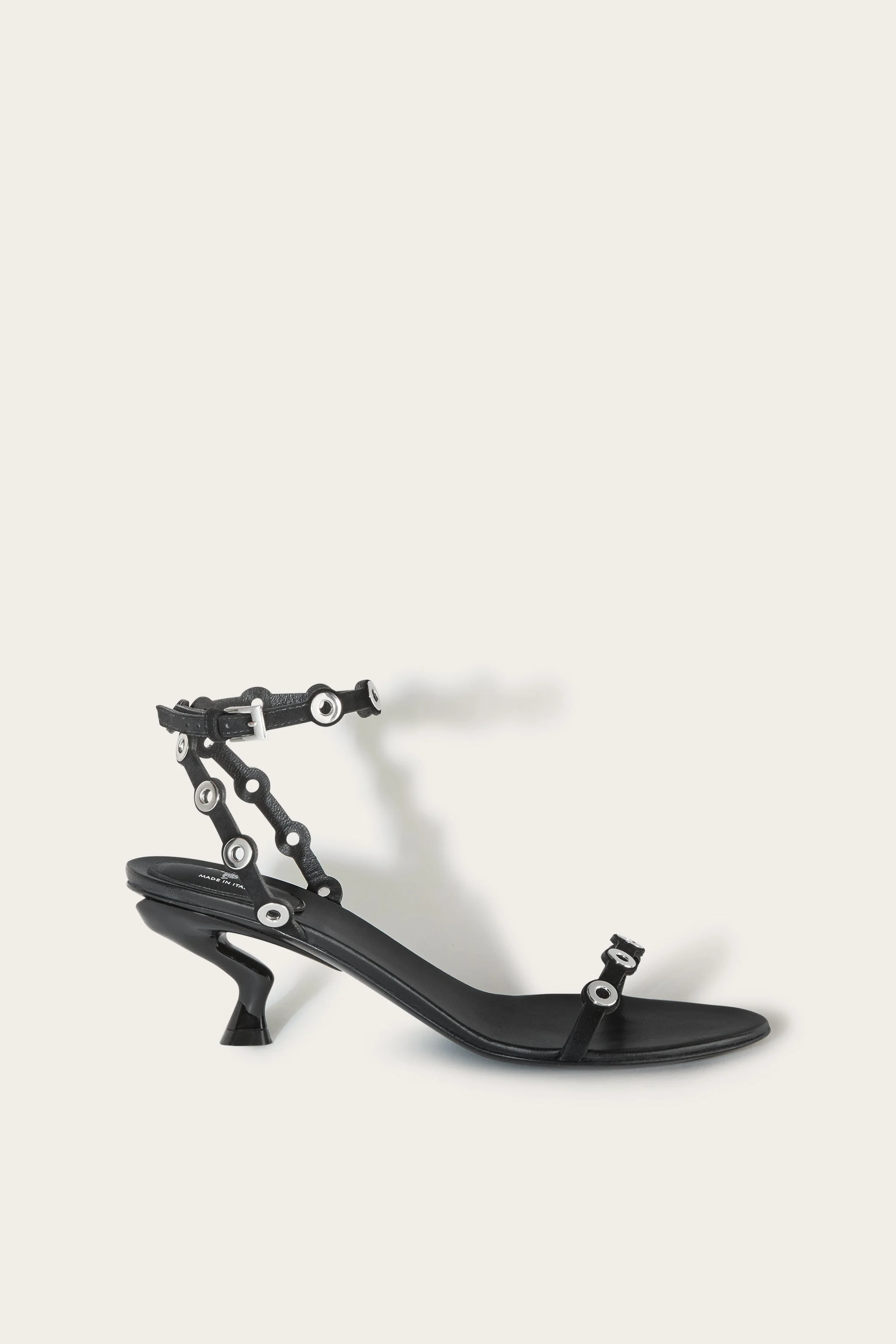 A perfect sandal to accompany you at any time of the day. With a discreet heel, it is the ideal companion for city walks, outdoor aperitifs or summer dinners. Suede embellished with micro metal studs adds a touch of grit without sacrificing sophisticated design. The buckle closure on the strap ensures a perfect fit. - Black - 55mm heel - Suede leather upper - Micro metal stud embellishments - Buckle closure on strap - Versatile and stylish design - ID: 5HCD645HX10999