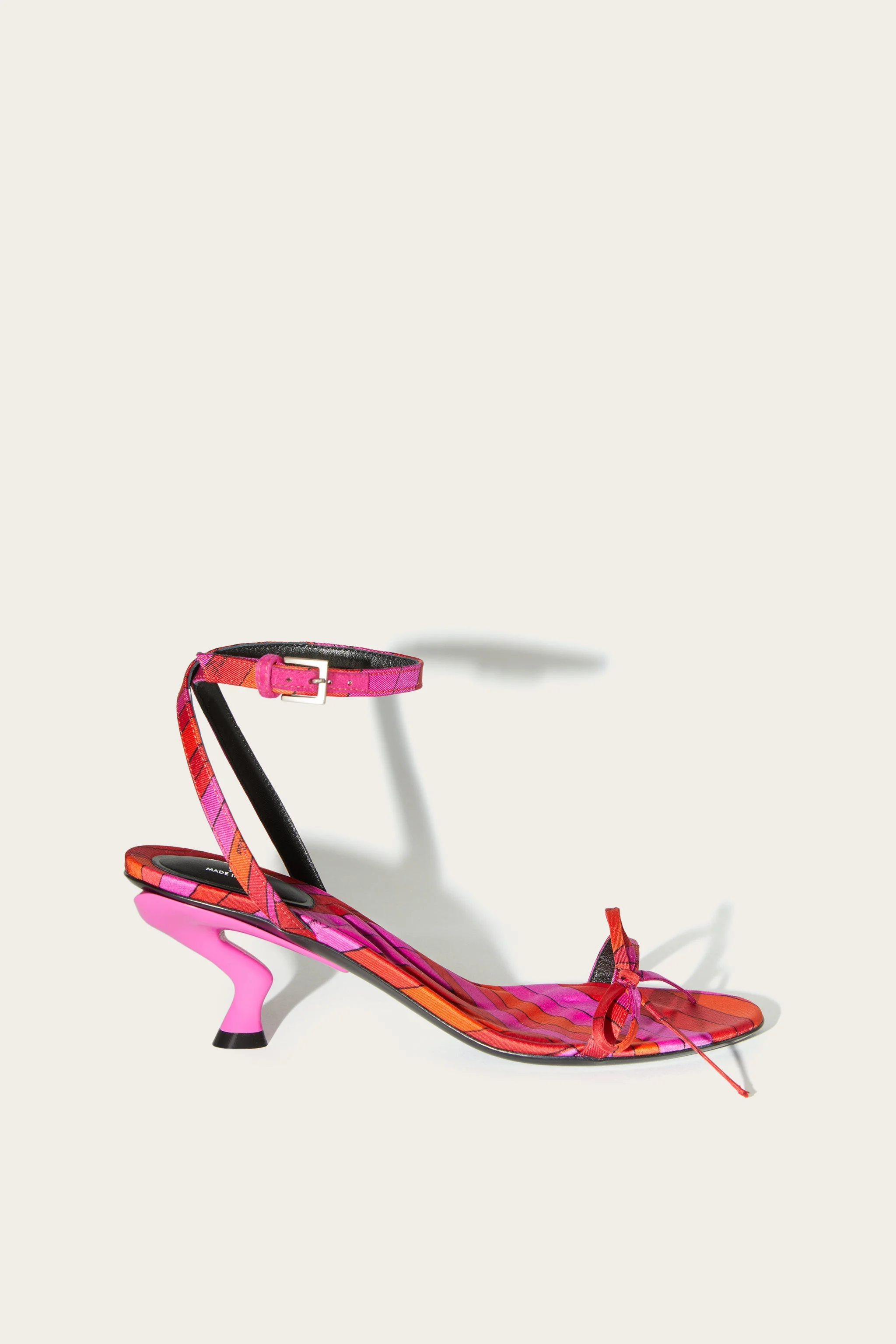 The psychedelic Iride print, inspired by the shape of the eye's iris, covers these sandals in vibrant shades of red and pink. With playful Pucci flair, the heel takes the articulated shape of a horse’s leg. - Kindly note that this product, as well as many other Pucci items, is made using an allover print and it falls differently on each garment, so the product you will receive may differ from the one in the picture. - Scarlet red, fuchsia pink, peony pink - Low sculptural heel - Open almond toe - Logo contoured footbed - Silver-tone metal hardware - Buckled ankle strap - 100% silk; lining: 100% lambskin; sole: 100% leather - Style ID: 4UCD804U251068 - Heel height: 55mm