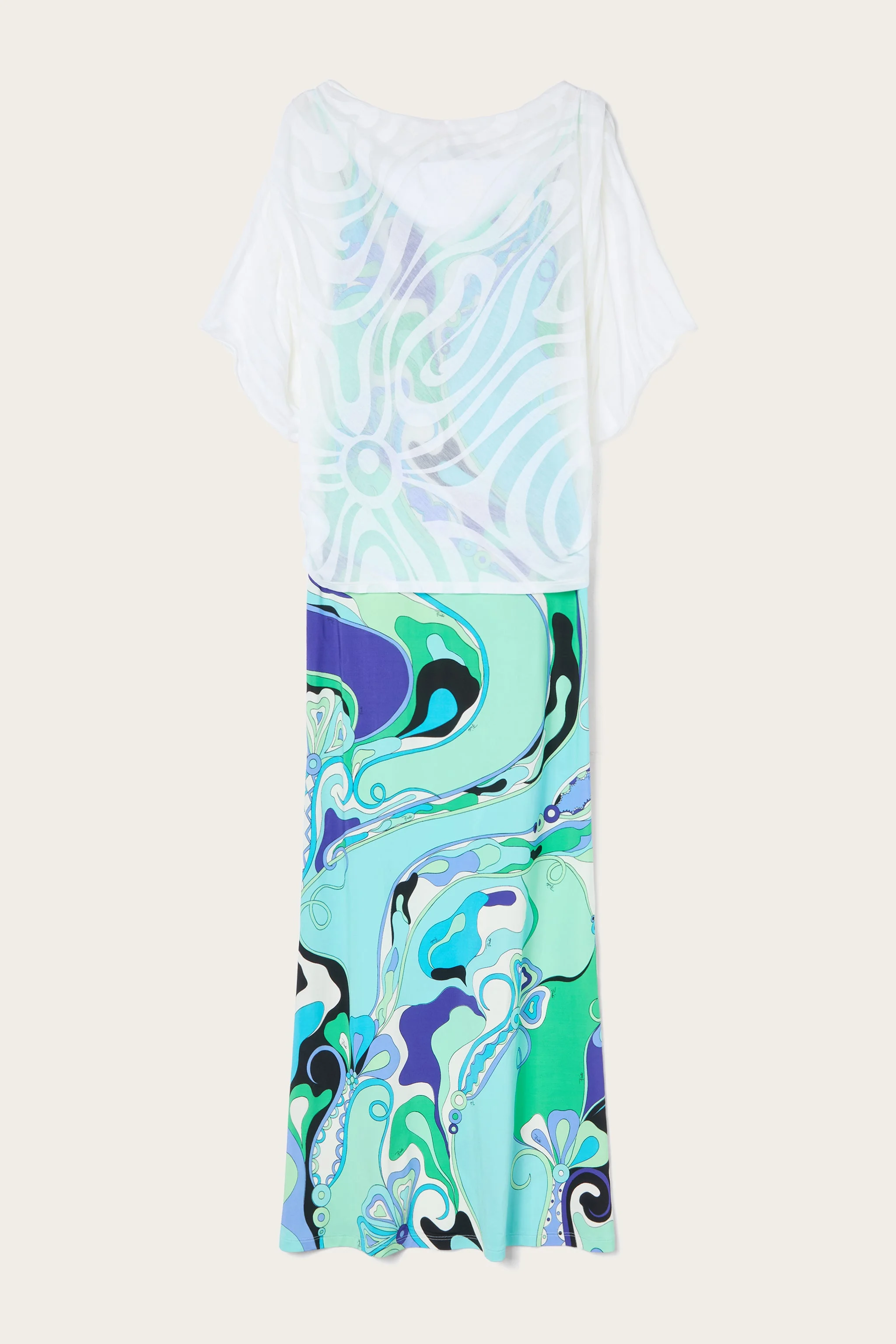 A dress that knows how to find its place in any occasion and within any closet: long and straight-cut, it combines minimalism and movement, thanks to the cape that downplays the look by revealing, thanks to playful transparencies. Made in Pucci's iconic jersey, this garment is distinguished by the iconic Orchidee print, an archival treasure from 1966, enriched with stylized flowers, which moves gracefully across the fabric, giving an even more sinuous effect. A garment that combines tradition and modernity for an unforgettable look. - Green and lilac - Long straight-cut dress with cape - Lycra jersey for a shiny, wrap-around effect - Orchidee print - Flowing, sophisticated design for special occasions - ID: 5HJI165H737025