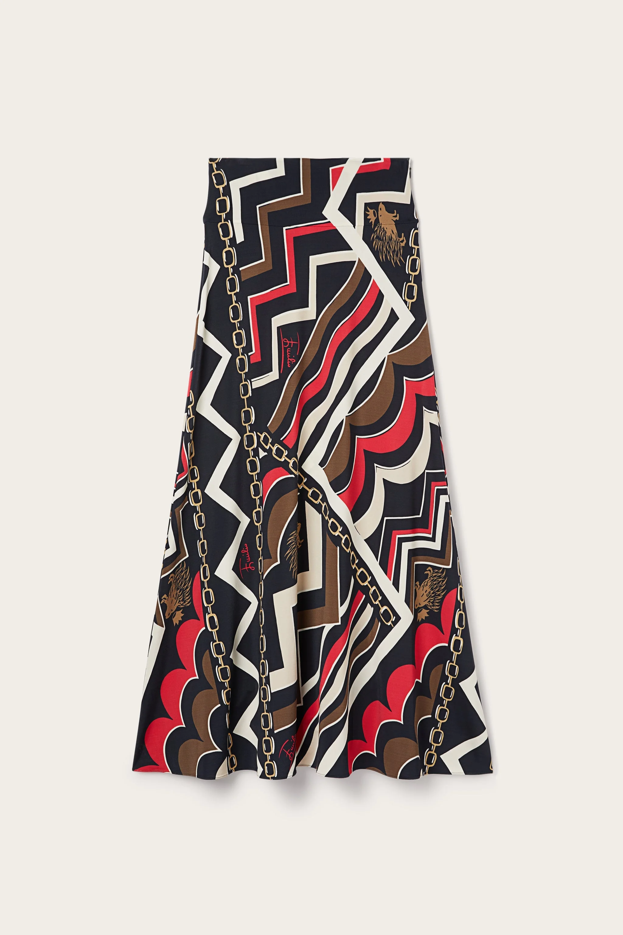 Fluid elegance you can wear. This straight-cut maxi skirt opens in a slight movement at the hem, enhancing the figure with grace and simplicity. The fabric, a shiny satin jersey, is made with twisted lycra yarns for natural shine and a flawless drape. The gold and red Istrice print, inspired by the Pucci archives, adds a sophisticated graphic touch that enlivens the silhouette with sophisticated vibes. - To offer you a unique Pucci garment, we use an all-over print that makes the product unrepeatable. Therefore, the pattern print may vary from the one displayed in the photo. - Gold and Red - Shiny satin jersey with twisted Lycra yarns - 95% viscose, 5% elastane - Istrice all-over print - Straight fit - Maxi length - Flowing hem - Stretchy and comfortable - Dry clean only - Made in Italy - ID: 5UJW105U727057