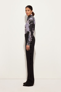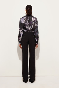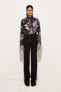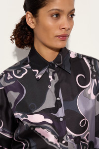 A nod to timeless elegance and refined femininity, this silk shirt revisits the poetic spirit of the Orchidee print, created in 1966 and inspired by Eastern aesthetics. The stylized lines of the flowers intertwine with organic movements that seem to envelop the body like sinuous branches, in a harmonious dance of shapes and colors. The design is classic and versatile, with a pointed collar, long sleeves, and button closure. The silk twill is finished to enhance its structure and highlight the natural brilliance of the material. The black and pink print adds a distinctive and iconic touch, ideal for elegantly interpreting every moment of the day. - To offer you a unique Pucci garment, we use an all-over print that makes the product unrepeatable. Therefore, the pattern print may vary from the one displayed in the photo. - Black and Pink - 100% Silk - Classic collar - Long sleeves - Front button closure - Regular fit - Standard length - Dry clean only - Made in Italy - ID: 5URJ085U731016