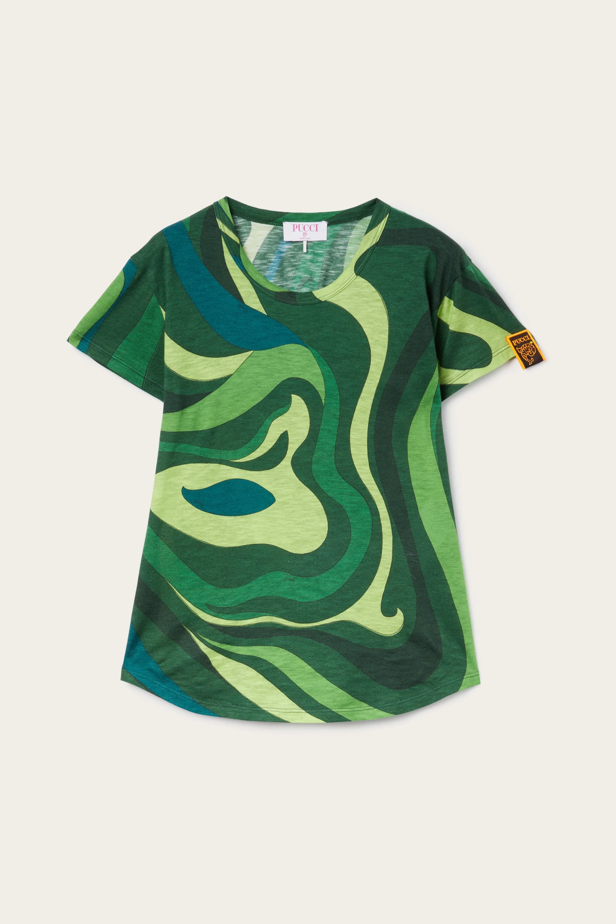 The modern interpretation of an essential garment. This Green Marmo print short-sleeved T-shirt combines simplicity and character, thanks to its regular fit and cut that falls gently below the waist. The clean lines and iconic print make it perfect for adding a distinctive touch to your wardrobe.Pair with the coordinating shorts for a sophisticated summer look or wear with denim for a casual, sophisticated outfit. - Green - Short sleeves - Regular fit and shoulders - Length just below the waist - Slub jersey - Allover print - ID: 5HTP355H981066