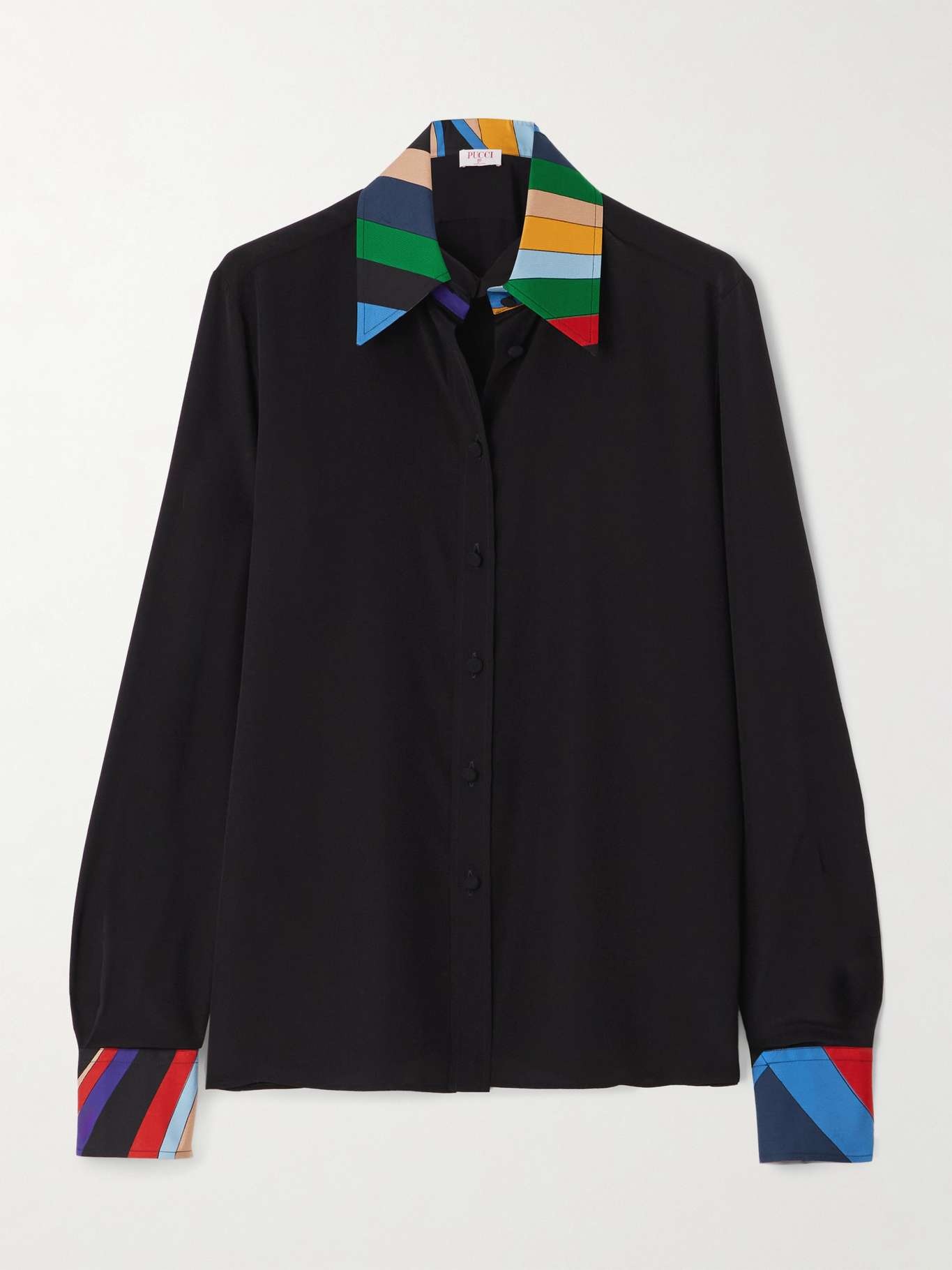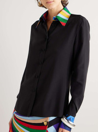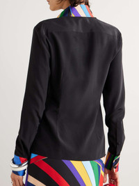 EDITORS'NOTES PUCCI's incorporates its signature colorful patterns into the collar and cuffs of this shirt, giving it a distinctly playful element. Made from silk-crepe, it has a relaxed fit and covered buttons. Tuck it into one of the label's vibrant skirts. SIZE & FIT Model measurements: - Fits true to size, take your normal size - Designed for a slightly loose fit - Lightweight, non-stretchy fabric - Model is 180cm/ 5'11" and is wearing an IT 40 - Bust: 81cm/ 32" - Waist: 63cm/ 25" - Hip: 91cm/ 36" DETAILS & CARE - Multicolored silk-crepe - Button fastenings through front - 100% silk - Dry clean