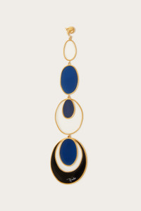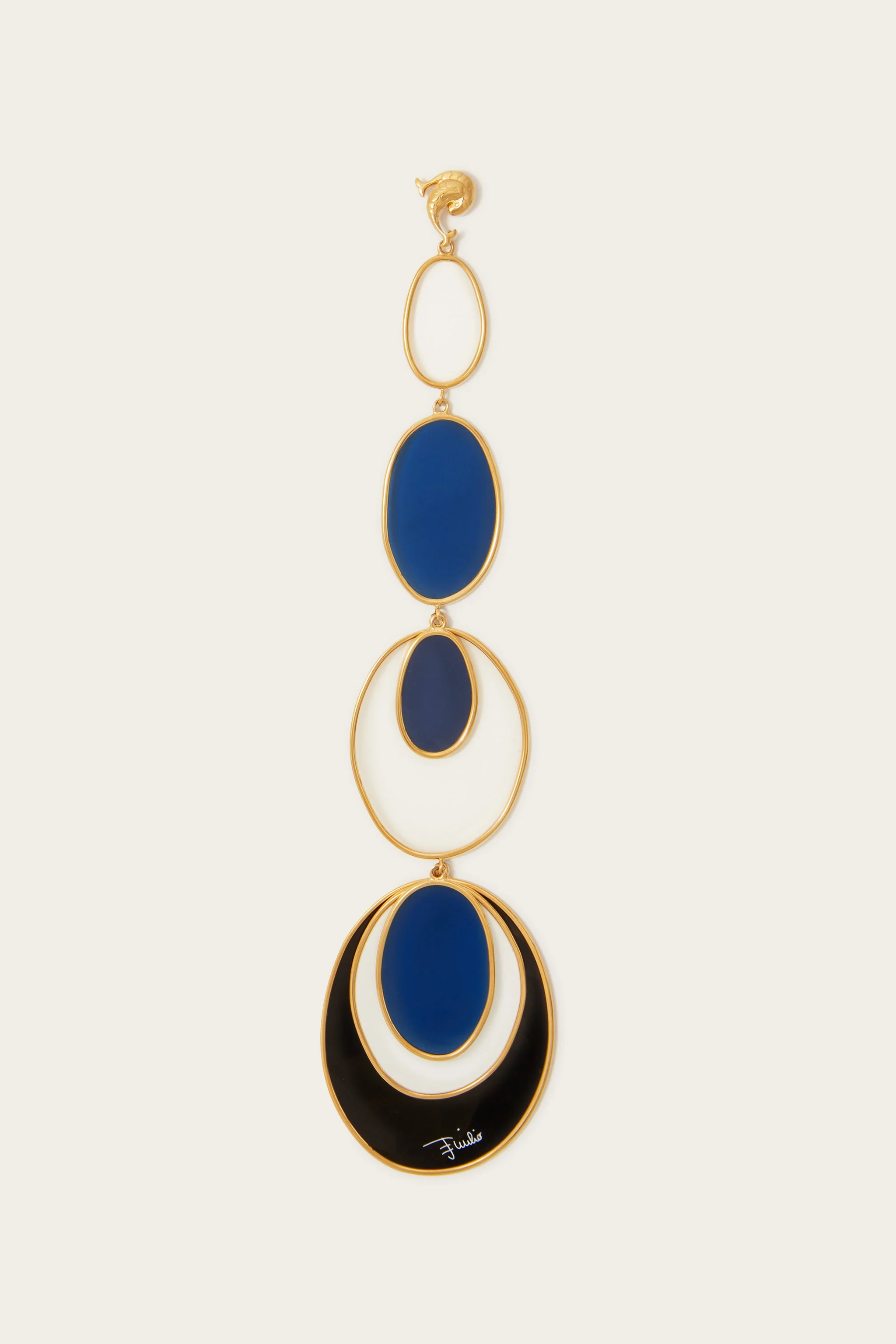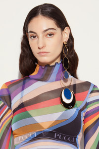 Pucci reinterprets iconic house codes, imagining the Bersaglio motif as concentric drops that cascade elegantly in this earring. The design is secured with the signature intertwined fish motif, a logo introduced by Camille Miceli. - Black, white, navy blue, dark blue - Logo detail - Gold-tone metal hardware - Post-back fastening - For pierced ears - Sold as a single earring - 100% resin - Style ID: 4UAL104U922N05 - Height: 25cm; width: 6cm; depth: 1cm