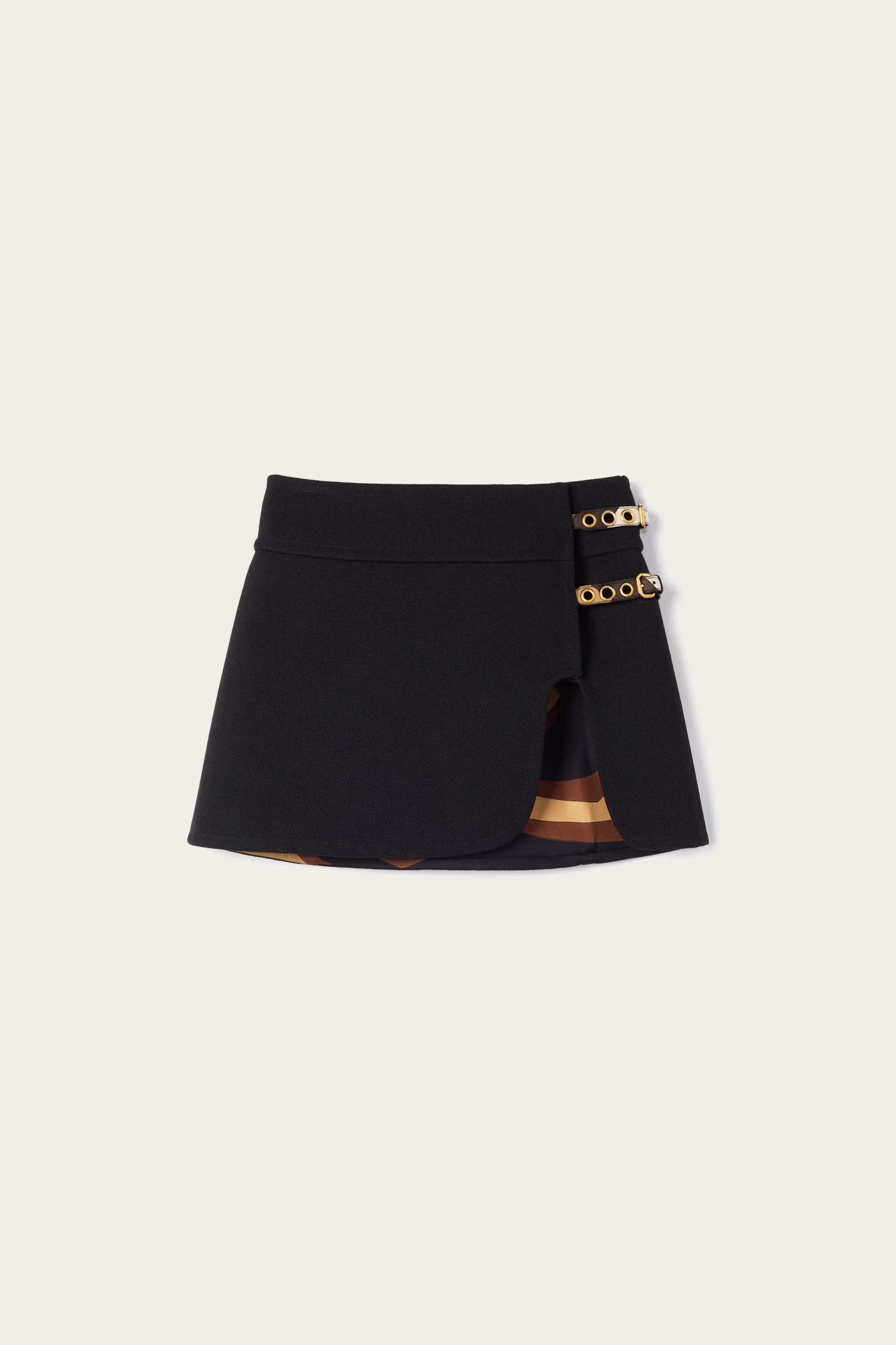 This skirt interprets the Pucci aesthetic with a bold, graphic touch. Crafted in Grande Poudre virgin wool, it stands out for its open hem on the leg and waist belt, which highlight its tailored construction. Inside, the printed lining reveals a surprise detail, faithful to the brand's tradition of unexpected and refined contrasts. An essential piece full of personality, designed to add character to any look. - Black - Main fabric: 100% virgin wool – Lining: internal print - Mini length - Open hem on the leg - Waist belt with closure - For washing instructions, refer to the label on the garment. - Made in Italy - ID: 5URV055U600999