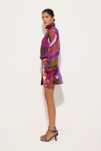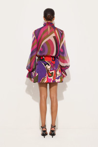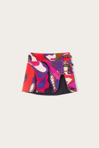 Inspired by the craftsmanship of Southeast Asia and a passion for nature, this cotton mini skirt stands out for its multicolor Orchidee print, one of the most iconic in the Pucci archive. The open hem on the leg adds a bold, feminine touch, while the belt closure at the waist enhances the silhouette. - To offer you a unique Pucci garment, we use an all-over print that makes the product unrepeatable. Therefore, the pattern print may vary from the one displayed in the photo. - Multicolor - Main fabric: 100% cotton - Secondary fabric: 100% cotton - Lining: 67% acetate - 33% polyester - Mini length - Open hem on the leg - Belt closure - Made in Italy - ID: 5URV065U788017