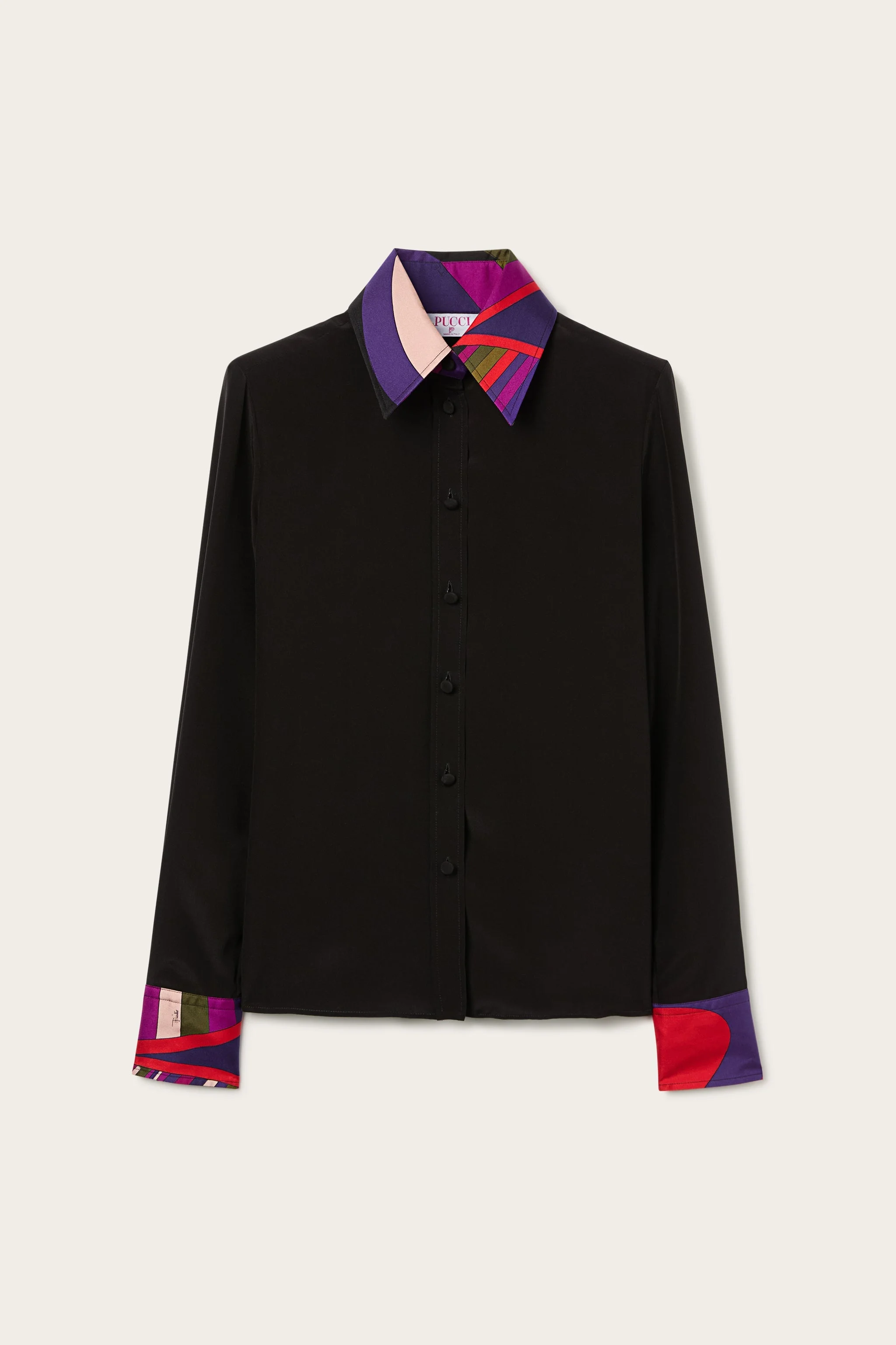 An essential piece becomes a style statement thanks to printed details that echo the iconic Pucci aesthetic. This solid black shirt, crafted from silk crepe de chine, features a collar and cuffs decorated with an archival motif that adds depth and personality to the look. The slim silhouette and regular shoulders maintain a refined and contemporary allure. - To offer you a unique Pucci garment, we use an all-over print that makes the product unrepeatable. Therefore, the pattern print may vary from the one displayed in the photo. - Black - Main fabric: 100% silk – Secondary fabric: 100% silk - Classic collar - Long sleeves - Printed cuffs - Front button closure - Slim fit - Regular shoulders - Dry clean only - Made in Italy - ID: 5URJ285U665999