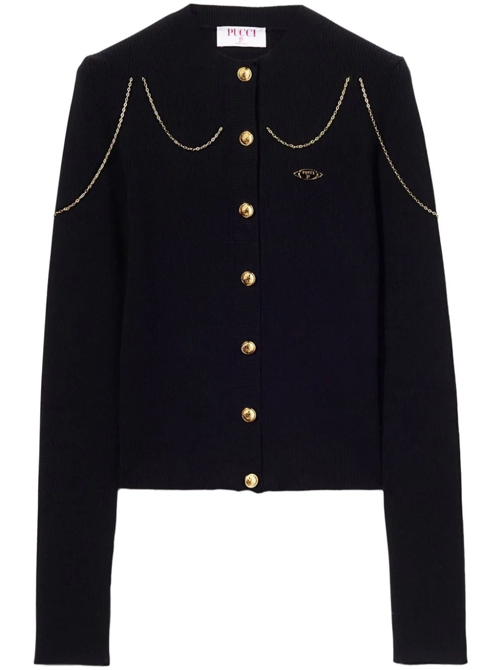 chain-embellished cardigan Highlights - Black - Ribbed knit - Chain-link detailing - Front button placket - Crew neck - Long sleeves - Logo plaque - Straight hem Made in Italy Composition Viscose 70%, Polyester 30%