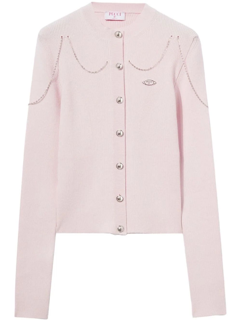 chain-embellished cardigan Highlights - Pink - Ribbed knit - Front button fastening - Long sleeves - Chain-link detailing - Straight hem - Cropped - Internal logo patch Made In Italy Composition Viscose 70%, Polyester 30%