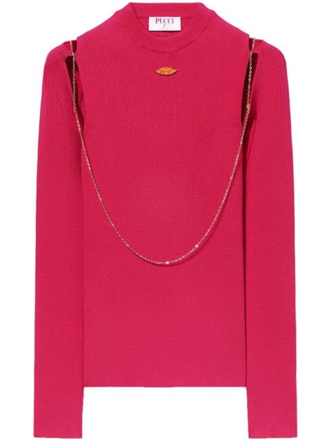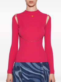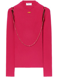 chain-embellished rib-knit top Highlights - Pink - Ribbed knit - Logo plaque - Chain-link detailing - Cut-out detailing - Round neck - Long sleeves - Straight hem Made in Italy Composition Viscose 70%, Polyester 30%