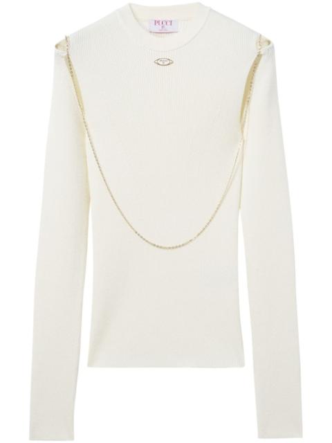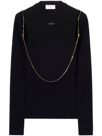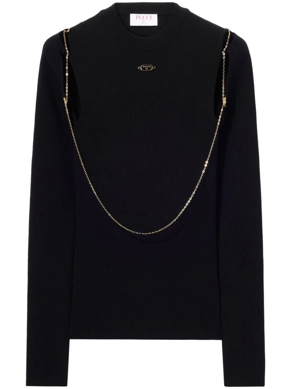 chain-embellished rib-knit top Highlights - Black - Chain-link detailing - Gold-tone logo plaque - Cut-out detailing - Round neck - Long sleeves - Straight hem Made in Italy Composition Viscose 70%, Polyester 30%