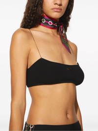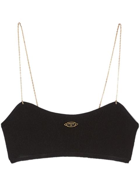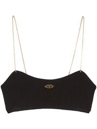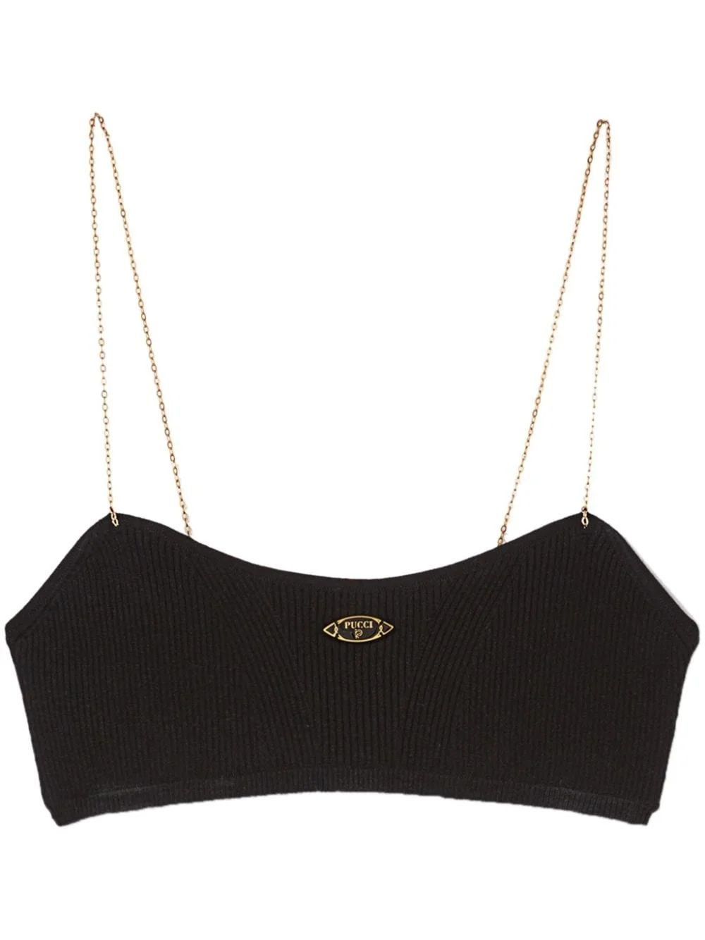 chain-strap ribbed bandeau top Crafted to a ribbed knit, this black PUCCI bandeau top is held in place by two dainty chain-link shoulder straps rendered in a golden hue. It's finished with an enamel logo plaque at the chest, acting as a branded note. Highlights - Black - Ribbed knit - Logo plaque - Square neck - Two chain-link shoulder straps - Straight hem - Cropped Made in Italy Composition Viscose 70%, Polyester 30%