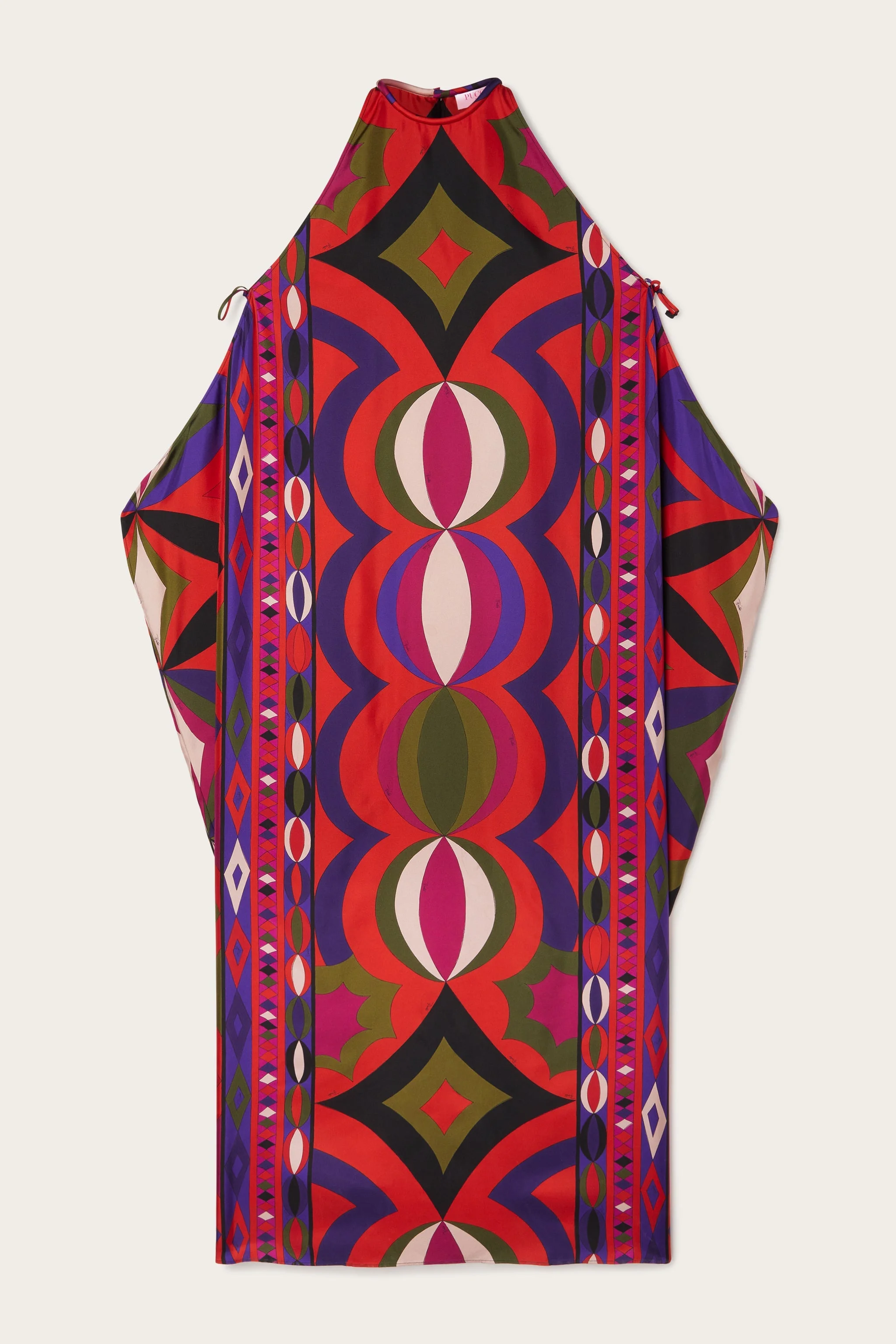 A flowing elegance that evokes bohemian spirits and refined holiday atmospheres: this long kaftan is an ode to lightness and freedom. Featuring open sleeves joined by two thin ties and a simple round neckline, it envelops the body with a loose and delicate fit. The Collane print, with its motifs inspired by tribal ornamentation and African decorative art, adds a lively and sophisticated touch to a timeless silhouette. - To offer you a unique Pucci garment, we use an all-over print that makes the product unrepeatable. Therefore, the pattern print may vary from the one displayed in the photo. - Multicolor - 100% Silk - Loose and soft fit - Round neckline - Open sleeves joined by ties - Maxi length - Dry clean only - Made in Italy - ID: 5URL255U881024