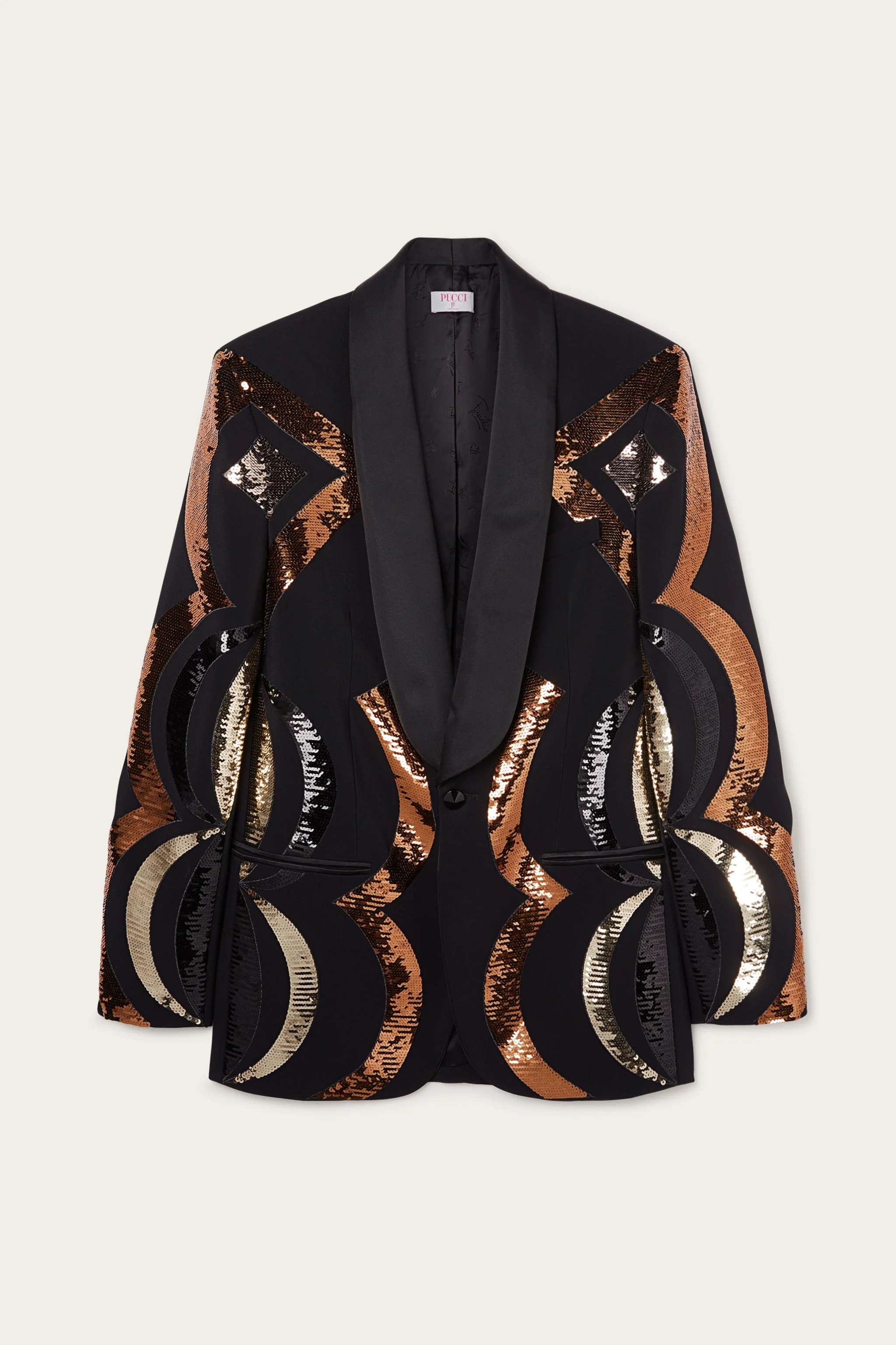 A tribute to the graphic opulence of the Collane motif, this oversized blazer combines a bold structure with refined details. Entirely machine-embroidered with multicolored sequins and metallic thread, it creates a jewel-like effect that captures the light and attention. The heavy black cady fabric, with its spongy, slightly crepe texture, enhances the garment's soft lines. The button closure and two front pockets complete the design with a touch of contemporary elegance. - To offer you a unique Pucci garment, we use an all-over print that makes the product unrepeatable. Therefore, the pattern print may vary from the one displayed in the photo. - Black - Heavy cady with sequin and metallic thread embroidery - Oversized fit - Front button closure - Front patch pockets - Dry clean only - Made in Italy - ID: 5URB065U601999