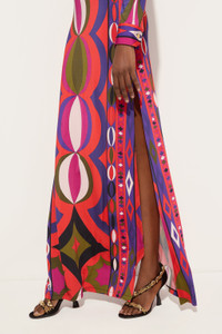 A simple, figure-hugging silhouette is enhanced by the silky sheen of satin jersey. This long-sleeved dress with a V-neck and button details is a contemporary reinterpretation of the iconic Pucci jersey. The fabric, made with twisted Lycra yarns, enhances every movement with an elegant sheen, while the Collane print—inspired by African tribal motifs—adds a graphic and vibrant character to the look. - To offer you a unique Pucci garment, we use an all-over print that makes the product unrepeatable. Therefore, the pattern print may vary from the one displayed in the photo. - Multicolor - Twisted Lycra satin jersey - 87% viscose, 13% elastane - Pointed collar - Long sleeves - Slim fit - Button details - Delicate dry clean - Made in Italy - ID: 5UJI665U887024