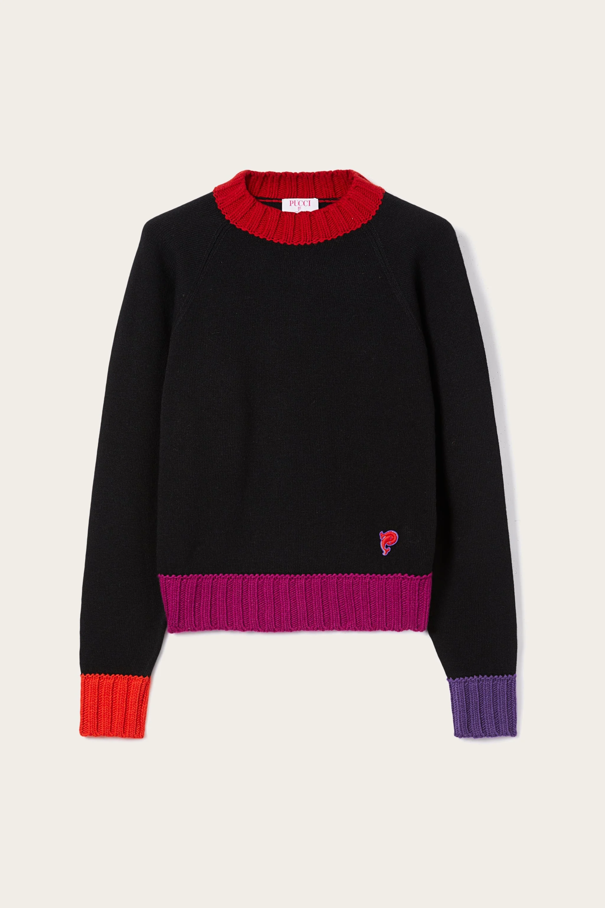 An essential piece that doesn't compromise on the distinctive Pucci touch. This basic sweater is made from pure wool, with a round neck and batwing sleeves that create a soft, relaxed silhouette. Heavier color block ribbed details add depth to the design, while the fish-shaped patch and multicolor Orchidee print inserts recall the iconic Pucci archive, expressing the brand's unmistakable artistic energy. - Multicolor - 100% wool - Round neck - Batwing sleeves - Heavy ribbed details - Fish patch - Orchidee print details - Delicate dry clean - Made in Italy - ID: 5UKM125U962017