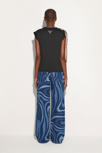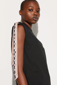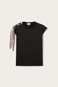 Decidedly minimal, yet full of character, perfect for those who love a modern, versatile style. This short-sleeved top, with its high neck and straight cut, stops elegantly at the waist, offering a clean, sophisticated silhouette. The drawstring detail on one of the sleeves adds a unique and distinctive touch, making the design simple yet memorablE. An essential item for any wardrobe, capable of fitting any occasion with elegance. - Black - Body: 100% Cotton - Belt: 100% Polyester - High neck - Short sleeves - Straight cut that falls at the waist - Lock on one sleeve - Wash very gently max 30°C. - Made in Italy - ID: 5HTP405H983999 - The model is 178 cm tall and wears a 38 italian size.