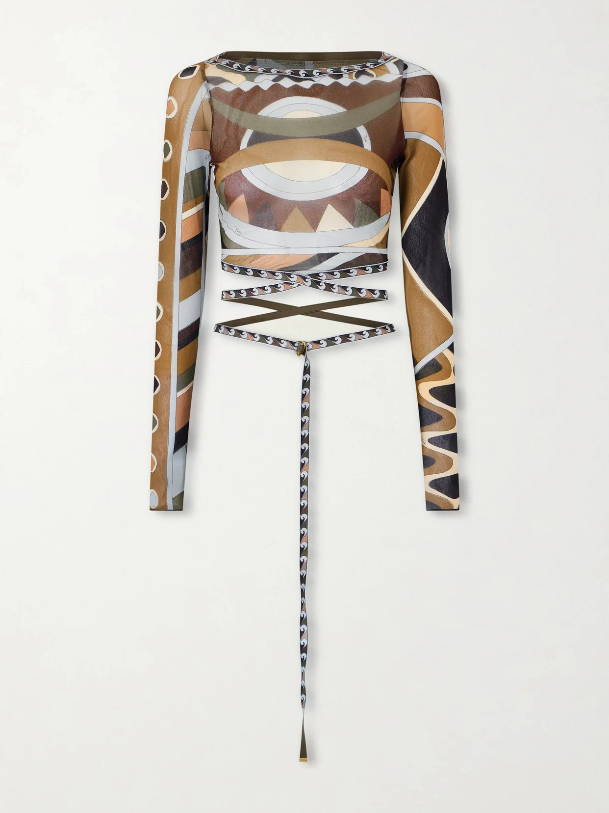 Pucci channels vibrant color and pattern into chic, modern silhouettes with this top. Made from tulle in the 'Vivara' print, it has a close fit with long sleeves and an adjustable waist strap that wraps elegantly to define the silhouette with a stylish twist.