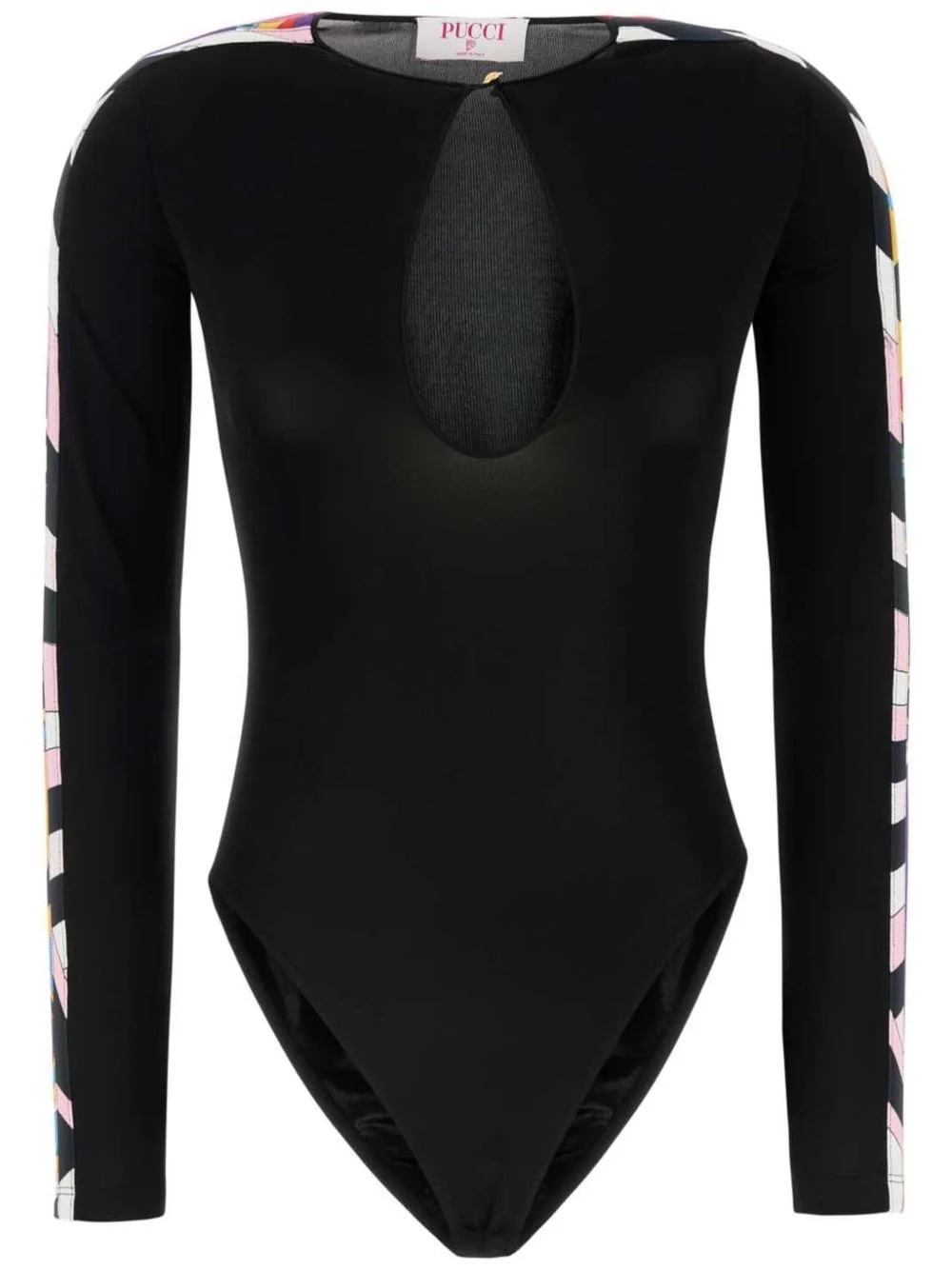 cut-out bodysuit Highlights - Black/multicolour - Stretch-design - Semi-sheer construction - Cut-out detailing - Front button fastening - Contrasting panel detail - Long sleeves - High cut - Just a reminder that this piece must be tried on over your own garments. Made in Italy Composition Viscose 95%, Spandex/Elastane 5%