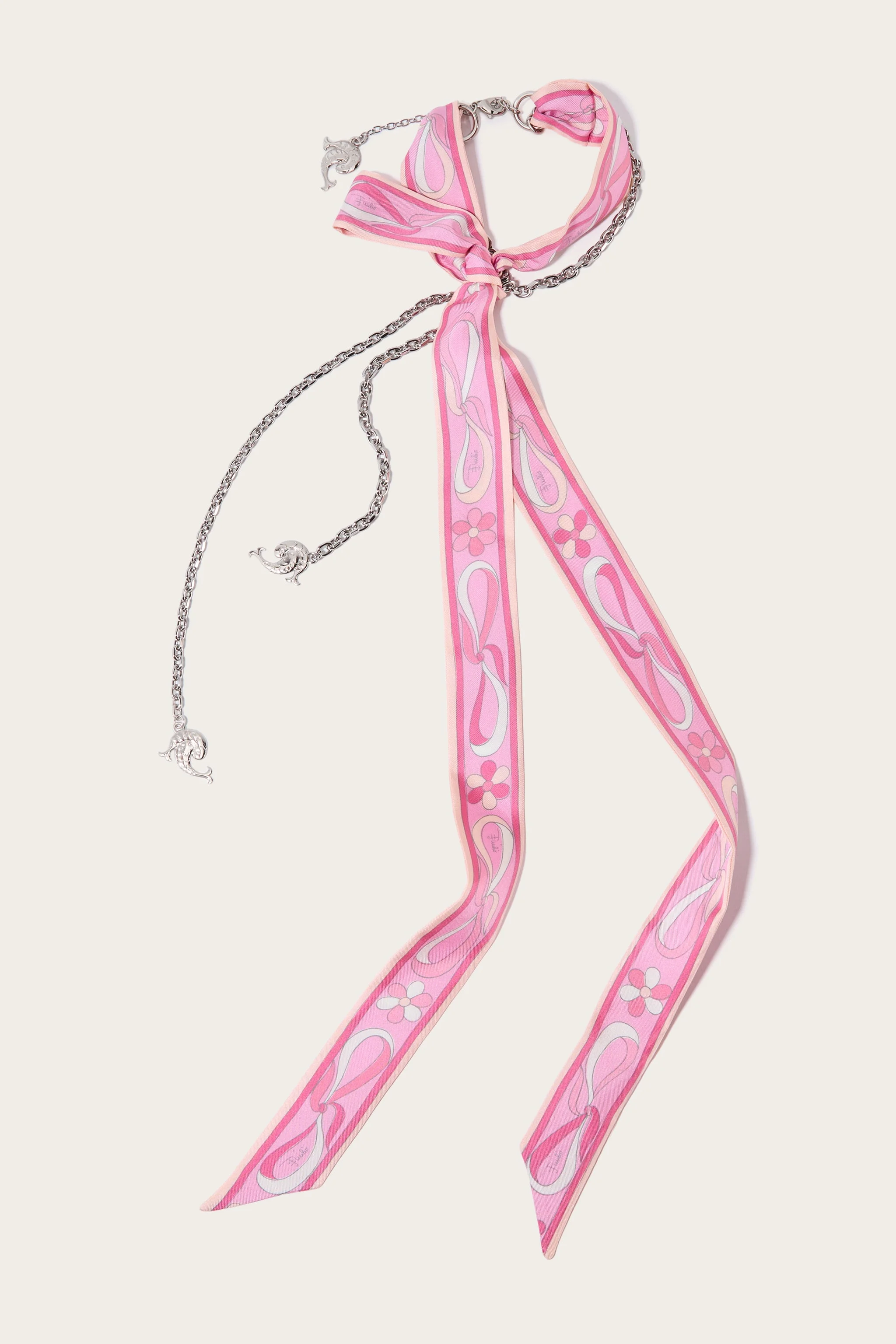 An accessory that embodies refined elegance with a touch of originality: a silk band that knots into a bow, adding a note of freshness and charm to any look. The delicate bow print evokes classic elegance, while the shiny palladium brass chains, embellished with Pesci-shaped charms, give it a modern and distinctive look. Worn with an elegant dress or to add a glamorous touch to a simple top, it can't help but shine. - Pink - Printed silk - Brass chains with shiny palladium finish - Fish-shaped charms - Adjustable back hook for a perfect fit - ID: 5HAM025H283N52