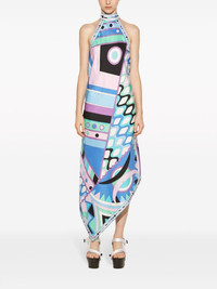 Vivara-print halterneck silk dress Highlights - Blue/multicolour - Silk - Satin finish - Abstract pattern print - Halterneck tie fastening - Backless - Asymmetric hem - Mid-length Made in Italy Composition Silk 100%