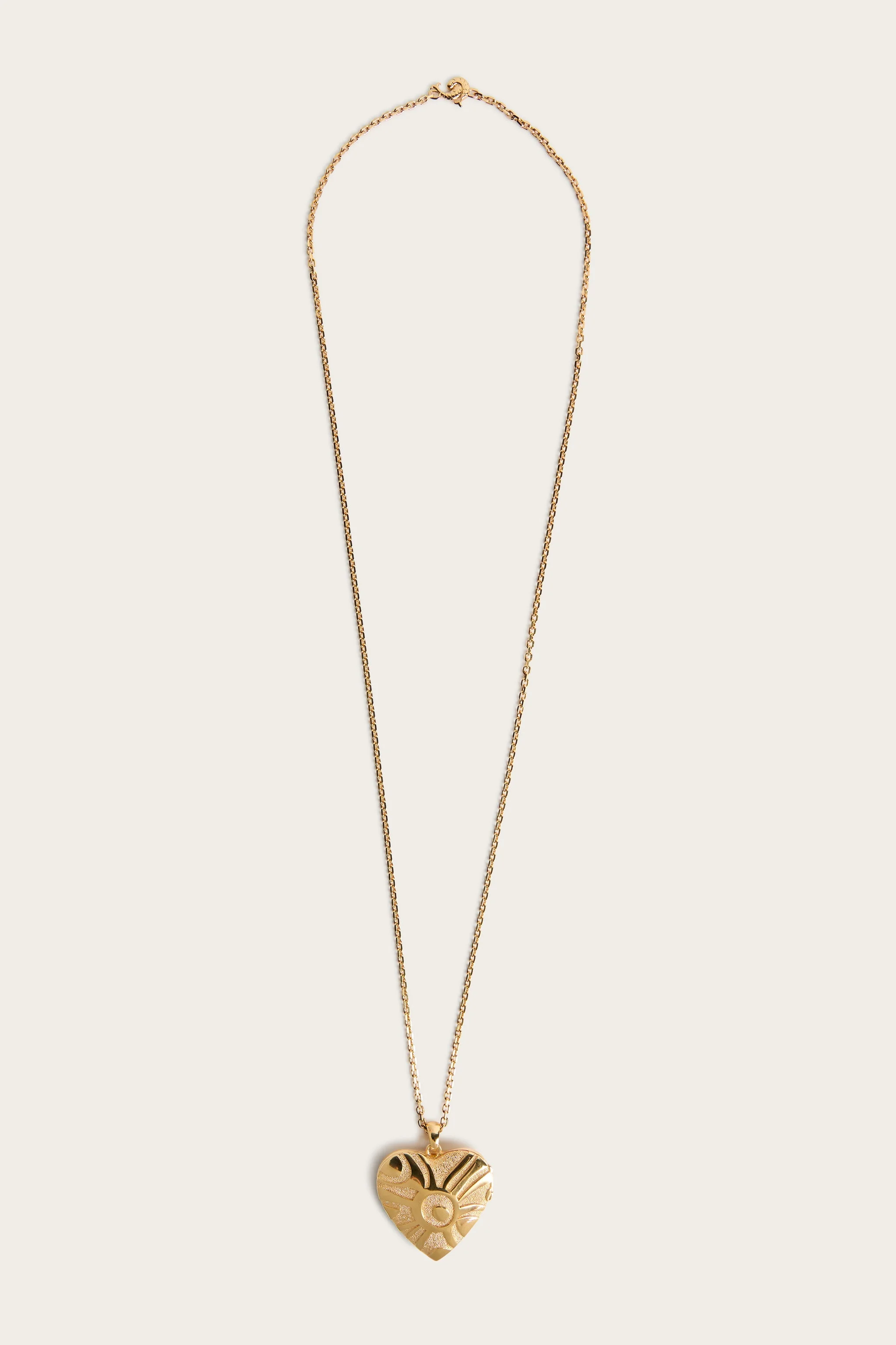 A decor piece of jewelry that combines femininity and vivacity. This brass necklace with a polished gold finish features a large heart-shaped pendant with pendant mirror and a refined Marmo embossed texture, inspired by Pucci's iconic archival print. The long chain, decorated with a fish-shaped detail, makes the piece easy to wear and perfect for completing any look, day or evening, with originality. - Polished gold - Material: Brass - Hear pendant with mirror and embossed Marmo texture - Long chain without clasp with fish detail - Don't wash - Made in Italy - ID: 5UAM355U920N01