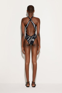 Elegance sculpted in detail. This one-piece swimsuit plays with sensual and sophisticated lines, thanks to the deep V-neckline and thin straps, which frame the back with extreme sophistication. The design comes to life through precious details: small round silver metal studs that create a sculptural and luminous effect. Made of stretch lycra with anti-UV treatment, it provides comfort, support and sun protection, making it the perfect ally for an unforgettable beach look. - To offer you a unique Pucci garment, we use an all-over print that makes the product unrepeatable. Therefore, the pattern print may vary from the one displayed in the photo. - Black - Stretchy Lycra with anti-UV treatment - One-piece swimsuit with V-neckline - Open back with thin straps - Silvered round metal hot fix stud details - Main fabric: 80% Polyamide, 20% Elastane - Main lining: 84% Polyester, 16% Elastane - Hand wash. - Made in Italy - ID: 5HMC175H643999 - Model is 178 cm tall and wears Italian size 38.