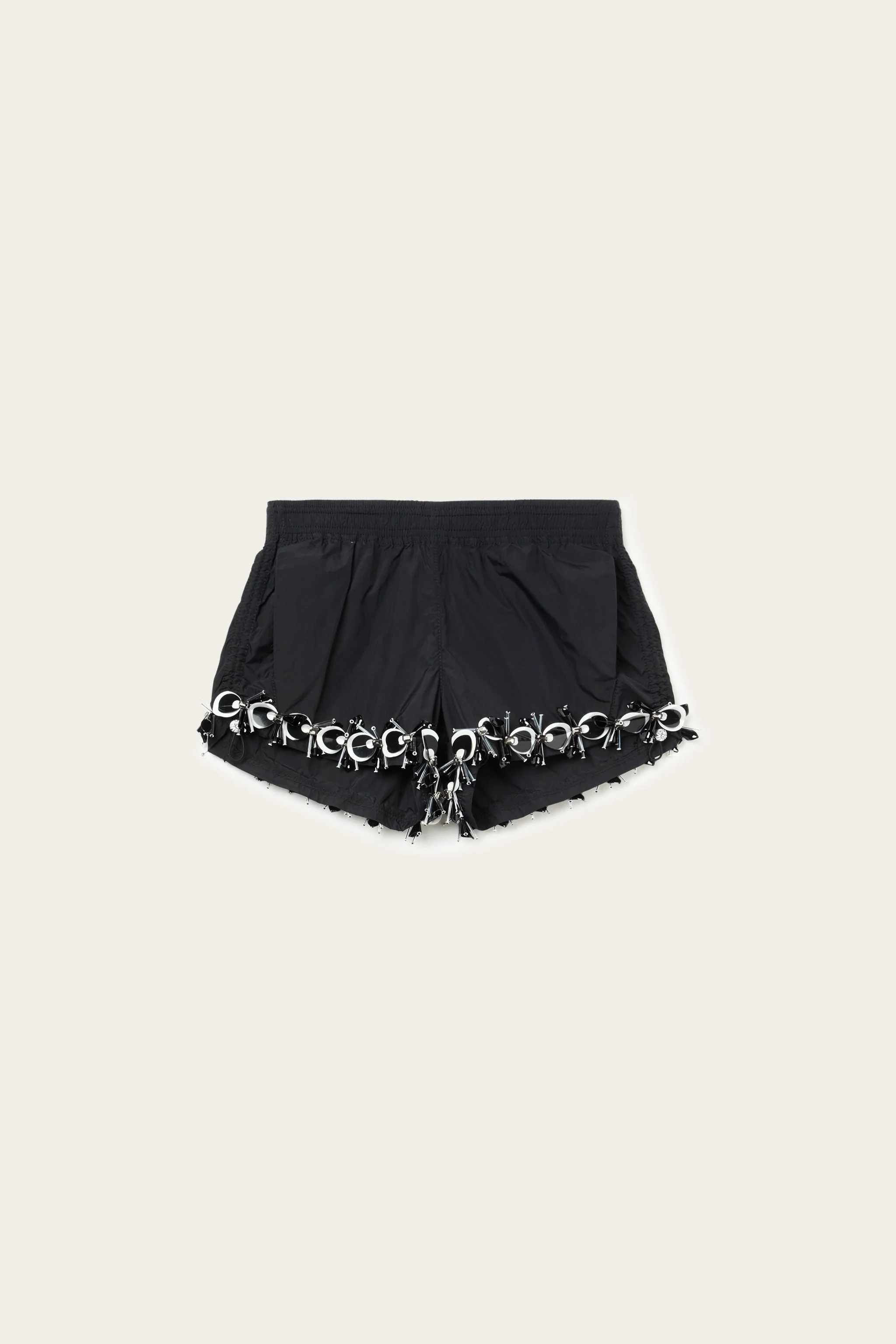 If you're looking for a garment that combines playful spirit and couture details, these embroidered shorts are the perfect choice. Their essential design is embellished with handmade embroidery that echoes the Pucci Pesci logo, adding a touch of character and uniqueness.Edges layered with sequins of different sizes and colors create a sparkling and sophisticated effect, while enameled metal cones and black diamond rhinestones add a bold and glamorous note. Made from a nylon fabric, they are ideal for those who like to experiment with style without sacrificing sophistication. - Black - 100% Polyamide - Hand-embroidered details - Layered sequin edging - Black enameled metal studs and black diamond rhinestones - Gently wash max 30°C. - Made in Italy - ID: 5HRU555H667999 - The model is 176 cm tall and wears a 38 italian size.
