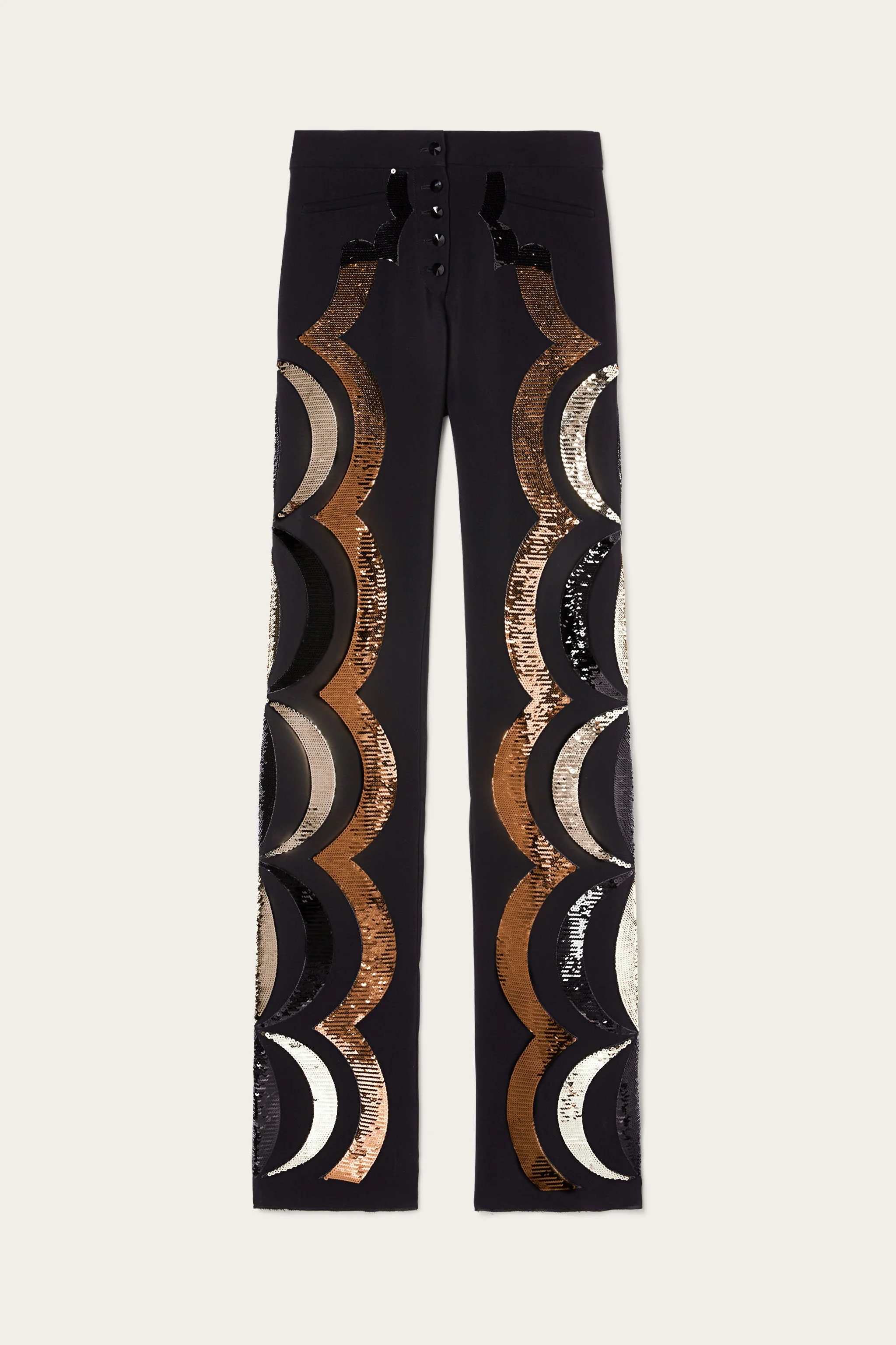 The clean lines of this black cady fabric pant meet refined craftsmanship. The design features side pockets, button closure, and a tailored construction. The focal point is the embroidery inspired by the Collane print: a brilliant interweaving of sequins in four colors and metallic thread, entirely machine-made, which recalls the decorative richness of African cultures and Pucci's artistic heritage. - To offer you a unique Pucci garment, we use an all-over print that makes the product unrepeatable. Therefore, the pattern print may vary from the one displayed in the photo. - Black - Main fabric: 96% viscose – 4% elastane – Lining: 67% acetate – 33% polyester - Straight cut - Side pockets - Button closure - Sequin and metallic thread embroidery - Dry clean only - Made in Italy - ID: 5URT625U601999