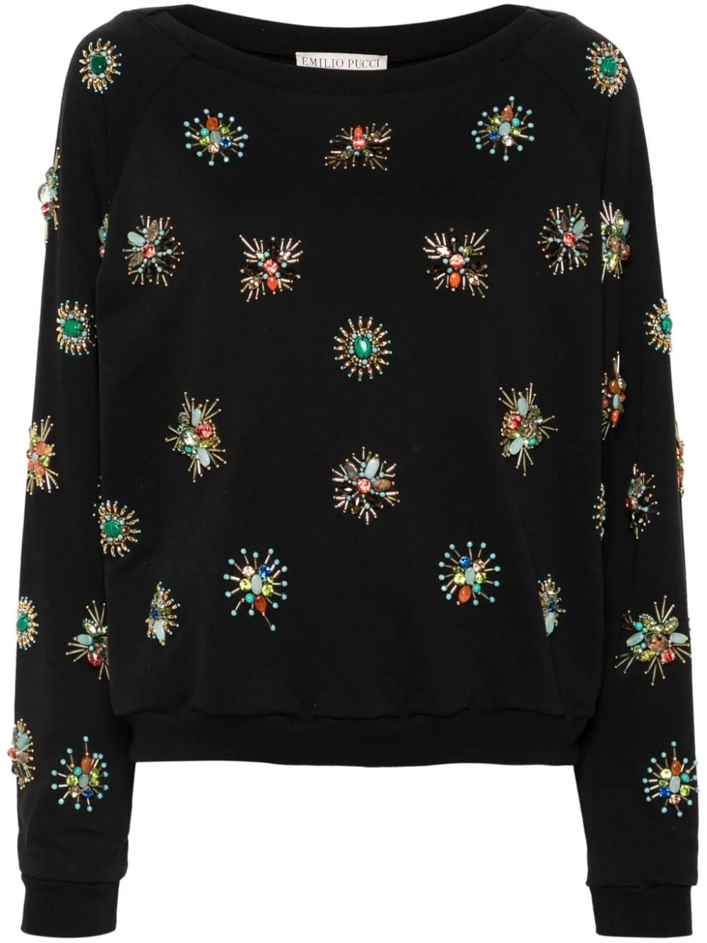 embroidered sweatshirt Highlights - Black - Cotton - Jersey texture - Bead and crystal embroidered design - Boat neck - Long raglan sleeves - Ribbed cuffs and hem - French terry lining - Straight hem Made in Italy Composition Cotton 100% SIZE & FIT Model measurements Height 5 ft 9 in(1.75 m) Bust/Chest 31.88 in(81 cm) Hips 34.64 in(88 cm) Waist 24.01 in(61 cm) FittingInformation Designed for a relaxed fit, this piece allows for comfort and movement when worn Made from a midweight non-stretch fabric, this piece offers minimal elasticity when worn