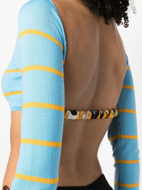 stripe-jacquard wool cropped top PUCCI focuses on the front panel of this cropped knit top, shaping the style around a horizontal stripe pattern with the open back connected by a single ruched elasticated strap. Highlights - Aqua blue/yellow - Wool - Round neck - Patterned jacquard - Horizontal stripe pattern - Long sleeves - Cropped - Open back - Elasticated strap Made in Italy Composition Wool 100%, Silk 100% SIZE & FIT Model measurements Height 5 ft 10 in(1.78 m) Bust/Chest 33.07 in(84 cm) Hips 36.61 in(93 cm) Waist 24.8 in(63 cm) FittingInformation This piece fits true to size. We recommend you get your regular size Cut for a slim fit Made with a mid-weight fabric