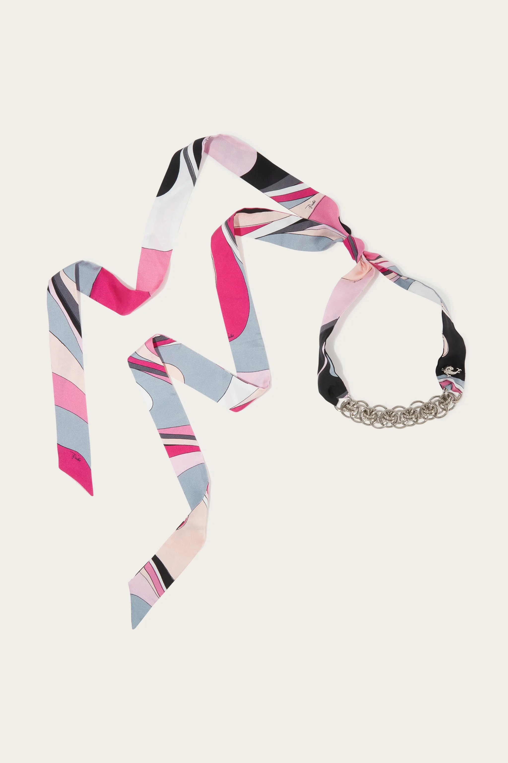 A piece of jewelry that chronicles the perfect balance of craftsmanship and contemporary style. This necklace combines a brass chain with two long silk ribbons featuring the iconic Onde print in pink. Versatile and refined, it lends itself to multiple interpretations: wear it as a necklace, knot it as a belt, or let the ribbons dance elegantly over a dress. Ideal for adding a touch of color and movement to your look. - Pink - Brass chain with polished palladium finish - Hand-printed silk ribbons (3.5 x 108 cm) - Versatile: necklace, belt or creative accessory - ID: 5HAM205H283N52