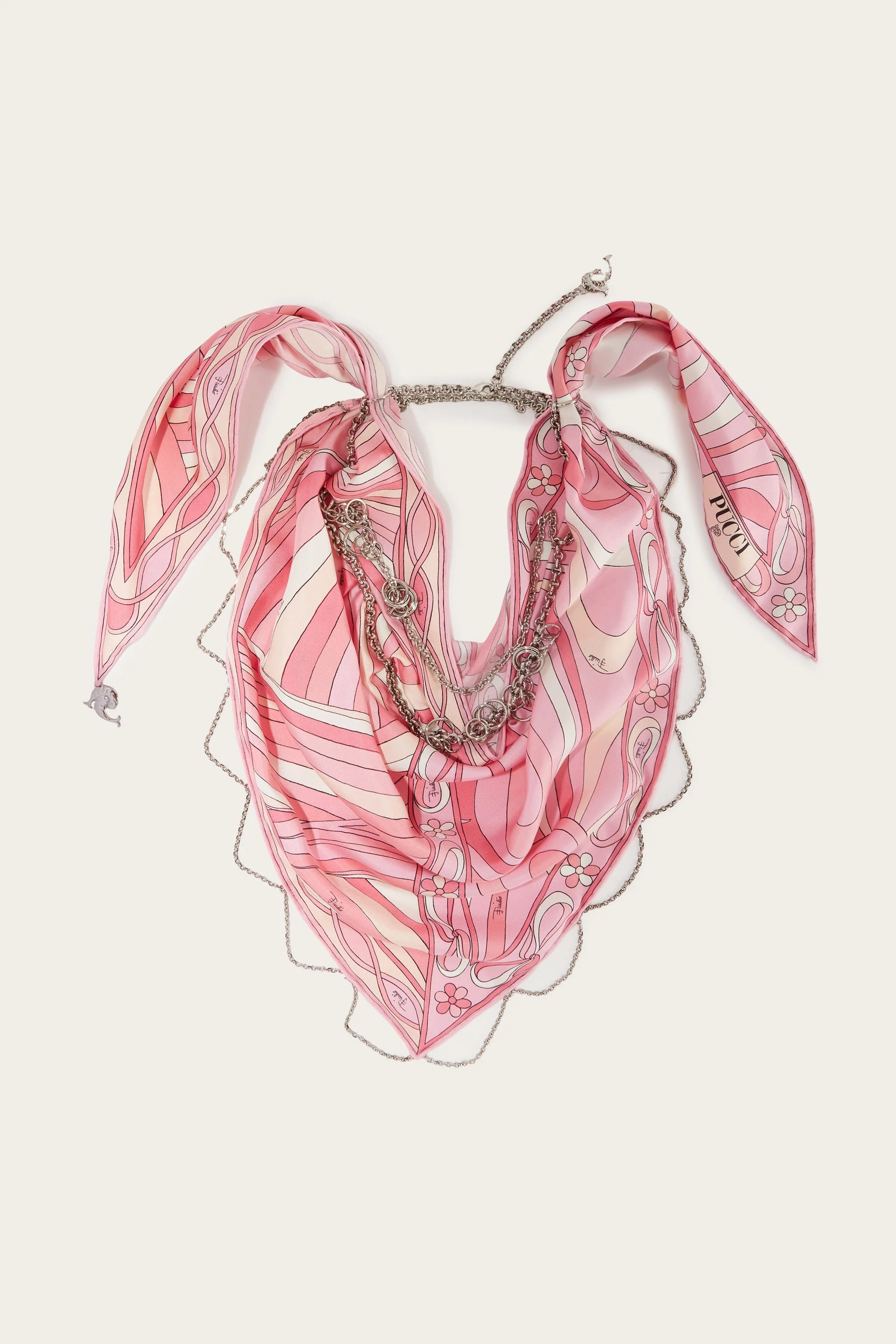 Foulard or jewel? More than that: an accessory that redefines the idea of elegance, combining the lightness of silk with the solidity of chains. This triangular scarf in fine printed silk is framed by refined garlands of golden chains that add movement and sparkle. The effect creates a sophisticated three-dimensional design, perfect for adding a glamorous touch to an evening dress or elevating a casual look. - Pink - Printed silk triangle 90x90 cm - Golden chain garlands on the hem - Adjustable hook on the back - ID: 5HAM115H283N52