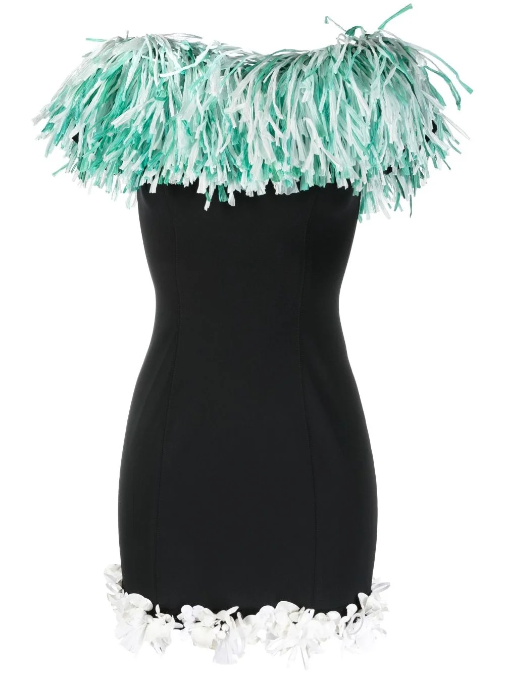 fringe-trim mini dress Highlights - Black/white - Fringe detailing - Floral applique - Off-shoulder - Bodycon design - Thigh-length Made in Italy Composition Polyamide 90%, Silk 50%, Raffia 50%, Elastane 10% SIZE & FIT Model measurements Height 5 ft 10 in(1.78 m) Bust/Chest 31.49 in(80 cm) Hips 37 in(94 cm) Waist 23.62 in(60 cm) FittingInformation Designed for a close fit throughout Made from a midweight stretch fabric, this piece offers elasticity and flexibility when worn This piece fits true to size – take your usual size