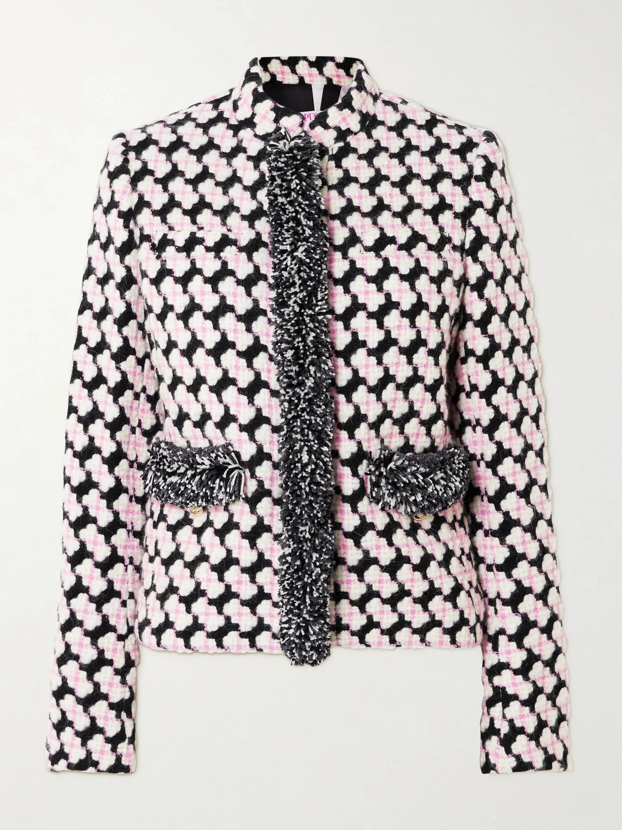 In black, white and pale-pink, the wool-blend tweed of PUCCI's jacket is made using a mixture of machine- and intricate hand-work. It's joyfully trimmed with pompom fringes across the placket and pockets. Wear yours with the matching skirt in our edit.