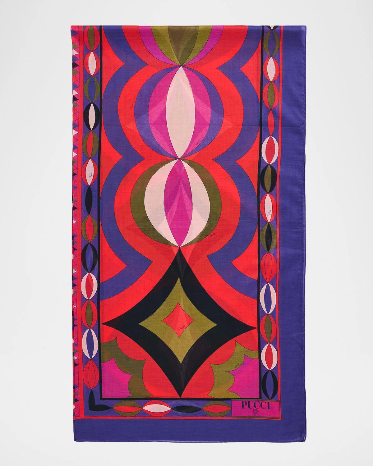 A bold geometric print in warm tones defines this cotton pareo from Pucci. Rectangular shape Logo print placed on the corner May be styled multiple ways Cotton Made in Italy